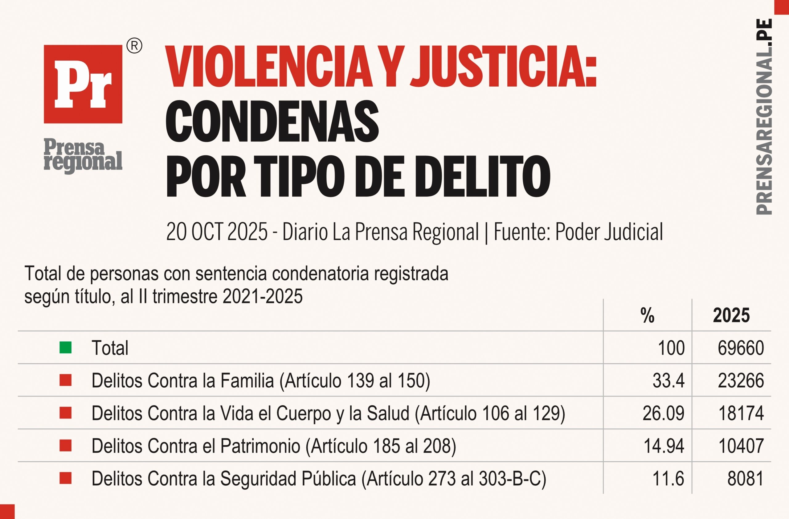 Durante el segundo trimestre de 2025, el Poder Judicial del Perú registró un total de 69,660 personas con sentencia condenatoria firme, según el reporte consolidado del Área de Estadística Judicial.