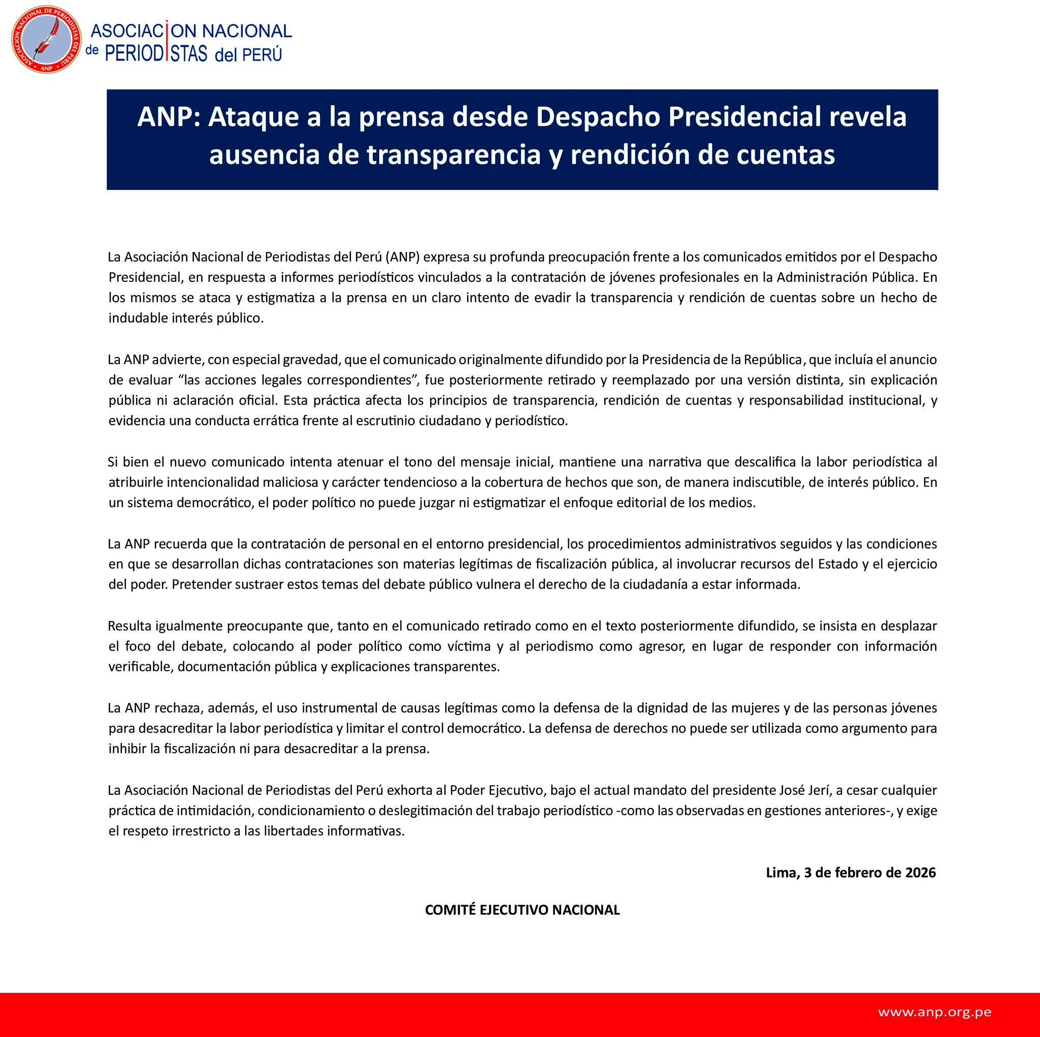La Asociación Nacional de Periodistas del Perú (ANP) expresa su profunda preocupación frente a los comunicados emitidos por el Despacho Presidencial, en respuesta a informes periodísticos vinculados a la contratación de jóvenes profesionales en la Administración Pública. En los mismos se ataca y estigmatiza a la prensa en un claro intento de evadir la transparencia y rendición de cuentas sobre un hecho de indudable interés público.