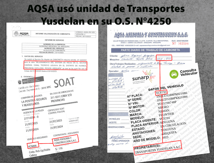 Sin embargo, semanas después, el Gobierno Regional de Arequipa recibió otra cotización para un servicio prácticamente idéntico, esta vez de la empresa Transportes Yusdelan S.A.C. La sorpresa surgió cuando los funcionarios compararon las imágenes presentadas: eran exactamente las mismas fotografías que había presentado AQSA en su expediente. Coincidía el ángulo, la ubicación, la iluminación, la sombra y hasta la posición de una piedra pequeña junto a la llanta delantera.