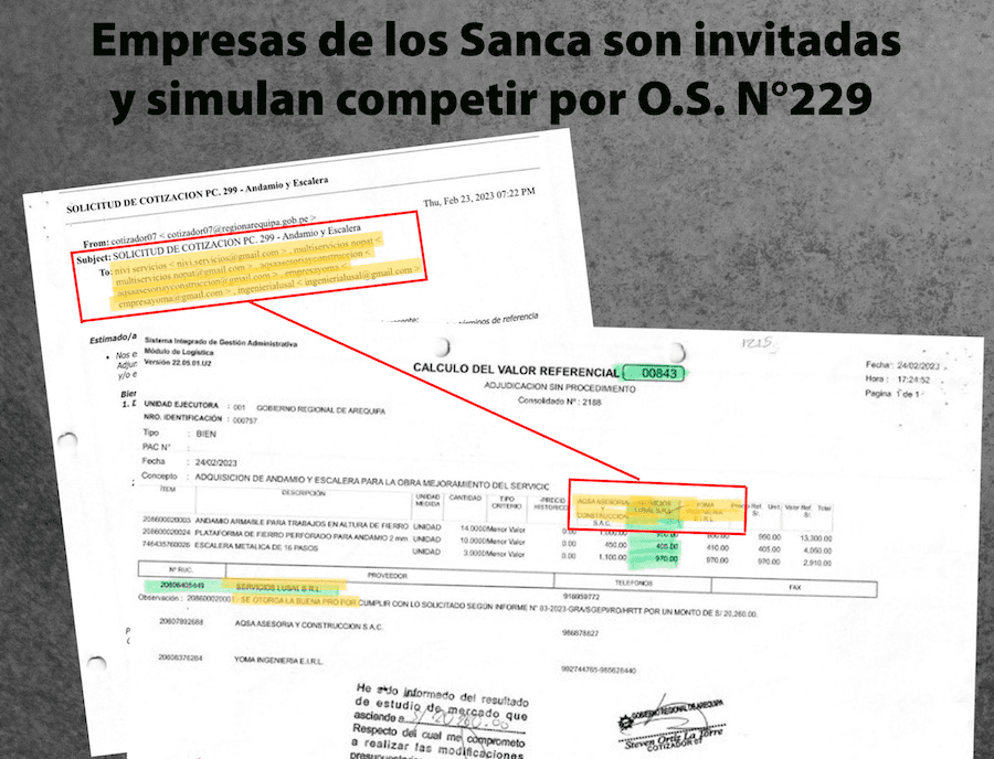 Algunos de estos antecedentes, son revelados con detalle y precisión, por El Búho en un reportaje firmado por el periodista Elmer Mamani, donde se expone cómo un conjunto de empresas vinculadas entre sí, teniendo como operador a Luis Sanca Umiyauri, obtuvo contratos consecutivos del Gobierno Regional de Arequipa (GRA) durante el 2023, simulando competencia y ruleteando órdenes de servicio.