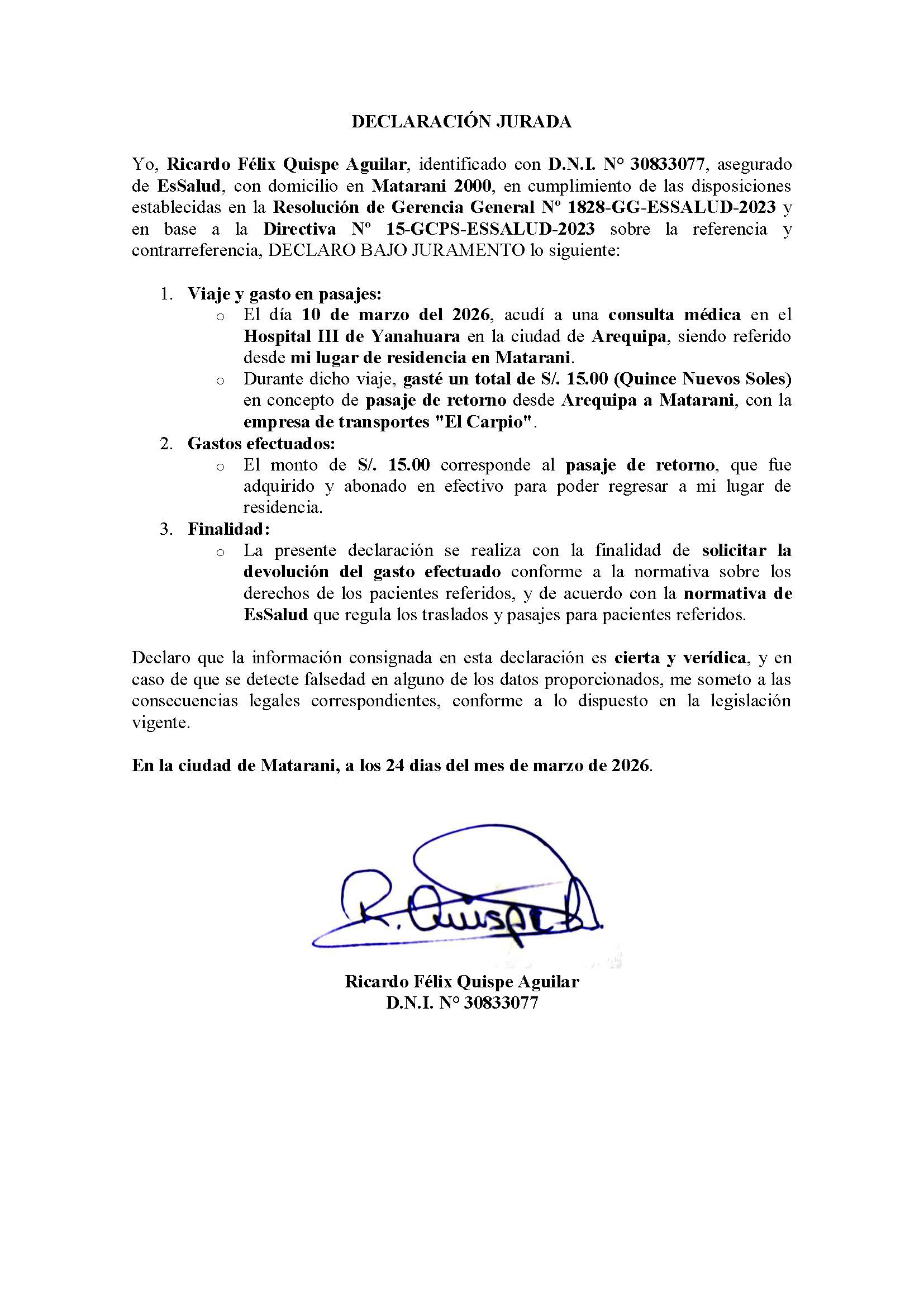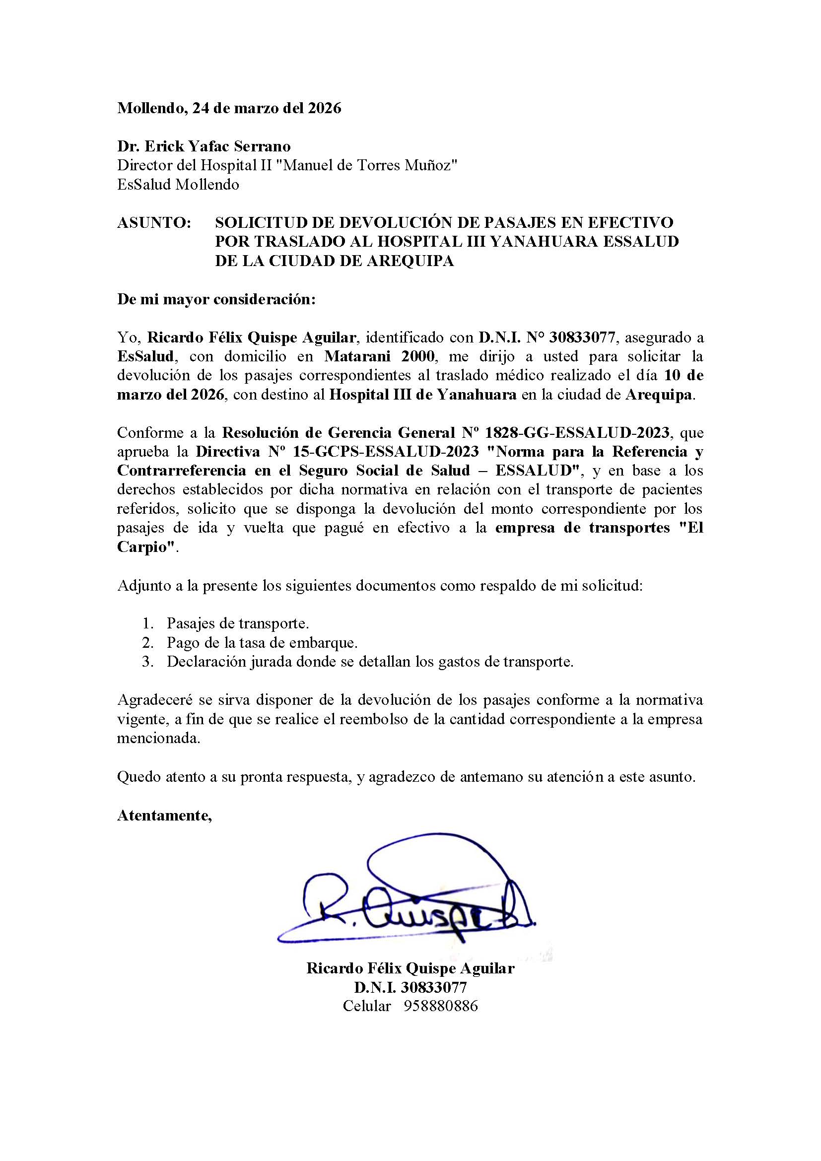 El ciudadano Ricardo Quispe Aguilar presentó una solicitud formal dirigida al director del Hospital II “Manuel de Torres Muñoz” de EsSalud Mollendo, Dr. Erick Yafac Serrano para requerir la devolución de los gastos de transporte asumidos durante un traslado médico a la ciudad de Arequipa.