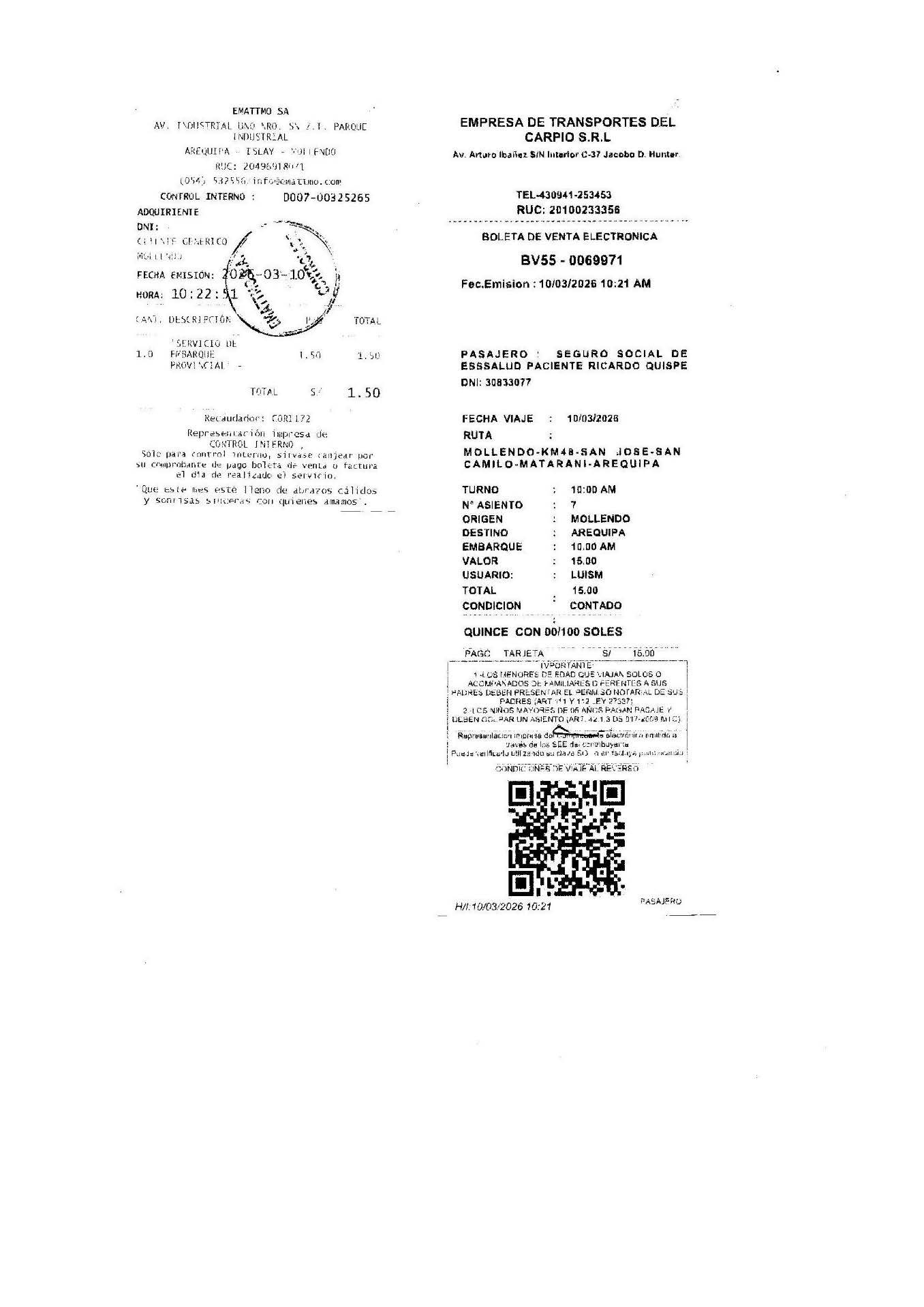 El asegurado señaló que el 10 de marzo de 2026 fue trasladado al Hospital III de Yanahuara de EsSalud por referencia médica, por lo que solicita la devolución del monto de los pasajes de ida y vuelta pagados en efectivo a la empresa Transportes Del Carpio.