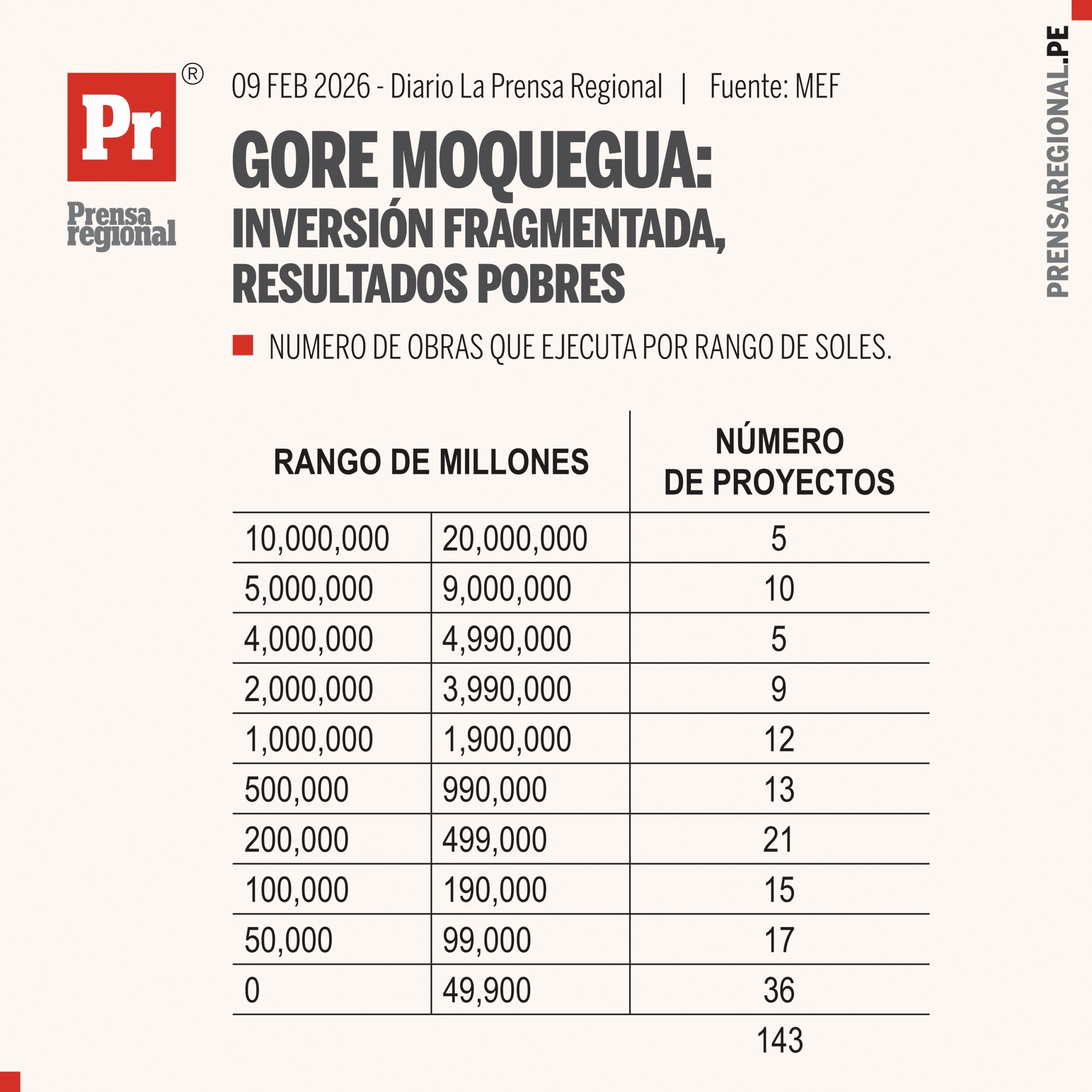 Para el año 2026, el Gobierno Regional de Moquegua ejecuta 143 proyectos de inversión, distribuidos en rangos de monto altamente fragmentados. El análisis cuantitativo y cualitativo de esta cartera evidencia una desviación estructural respecto al rol constitucional y legal del gobierno regional, particularmente frente a lo dispuesto por la Ley N.° 27867 – Ley Orgánica de Gobiernos Regionales.