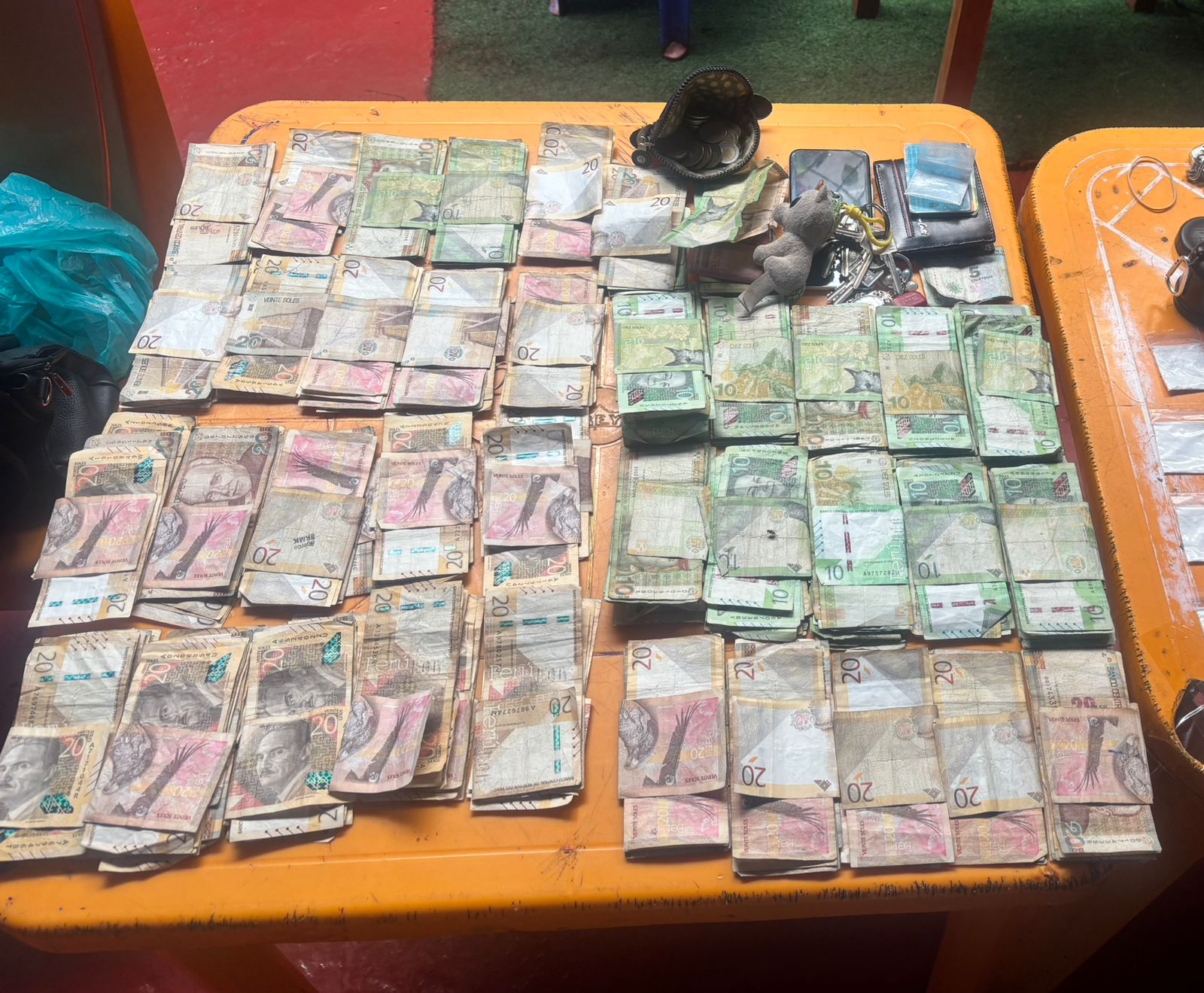 Horas más tarde, con presencia del Ministerio Público y la propietaria del establecimiento acompañada de su abogado, se efectuó una revisión más exhaustiva en uno de los ambientes internos. Allí se descubrió una cartera con S/ 7,380 soles, un juego de llaves que permitía el acceso a todas las áreas del local y otro envoltorio con presunta sustancia ilícita.