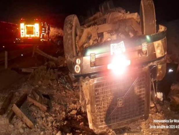 Un camión de nacionalidad boliviana, que transportaba soya, sufrió un accidente de tránsito tipo despiste y volcadura en la carretera Binacional, a la altura del kilómetro 83, en jurisdicción de Torata.