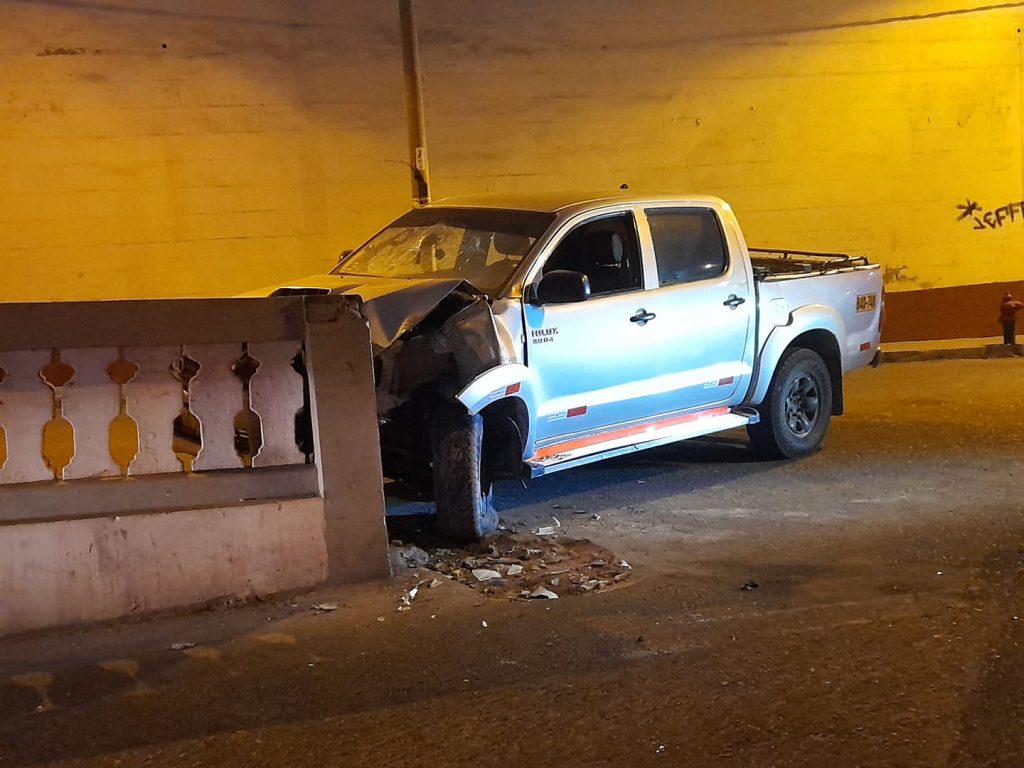 El conductor de la camioneta marca Toyota, modelo Hilux, 4×4, color plata metálico y de placa B4D-748, al parecer iba a excesiva velocidad, por lo que no pudo controlar el vehículo y este colisionó contra la pared.