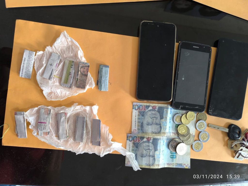 Durante el operativo se incautó 10 envoltorios de alcaloide de cocaína (peso aproximado: 10 gramos), S/. 223.60 en efectivo, presuntamente producto de la venta de droga, dos equipos celulares (marcas Motorola y Huawei) y un vehículo Kia Picanto usado para la distribución