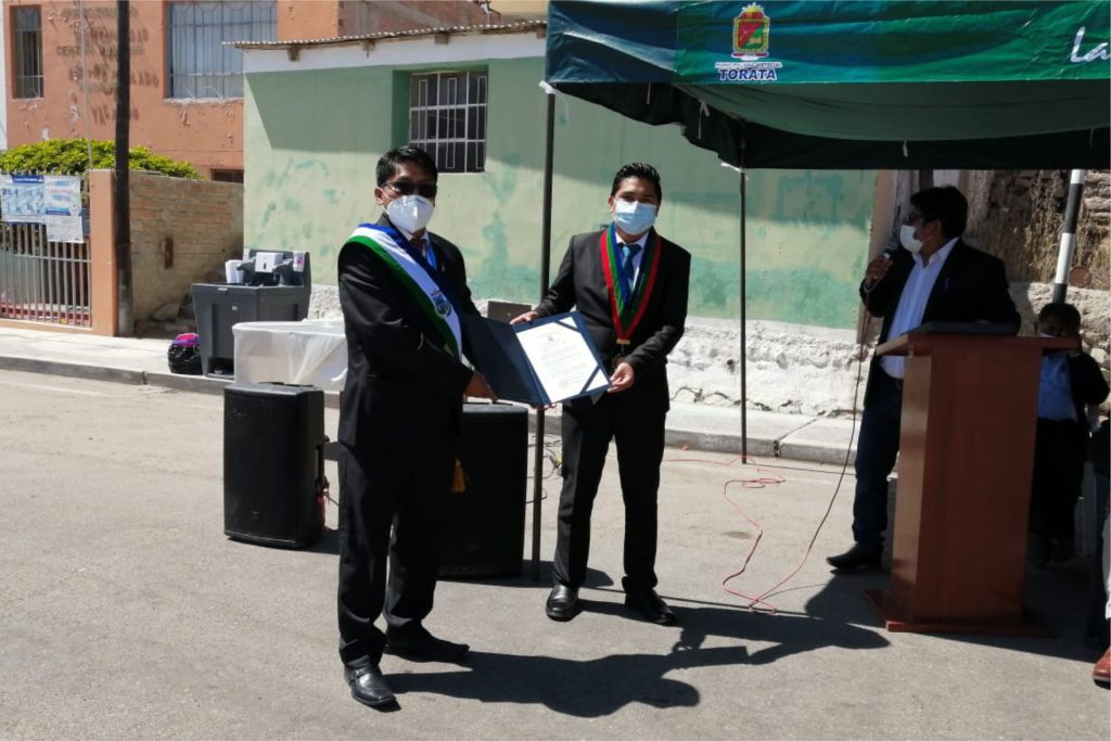 Entregó al alcalde del centro poblado de Yacango, Wilfredo Catacora Chambilla una resolución y un galvano como muestra de unidad y ratificar el compromiso de sumar esfuerzos por el desarrollo de la provincia Mariscal Nieto. El regidor también participó de la inauguración del local de la Asociación Mercado de Productores Agropecuarios San Isidro de Yacango.