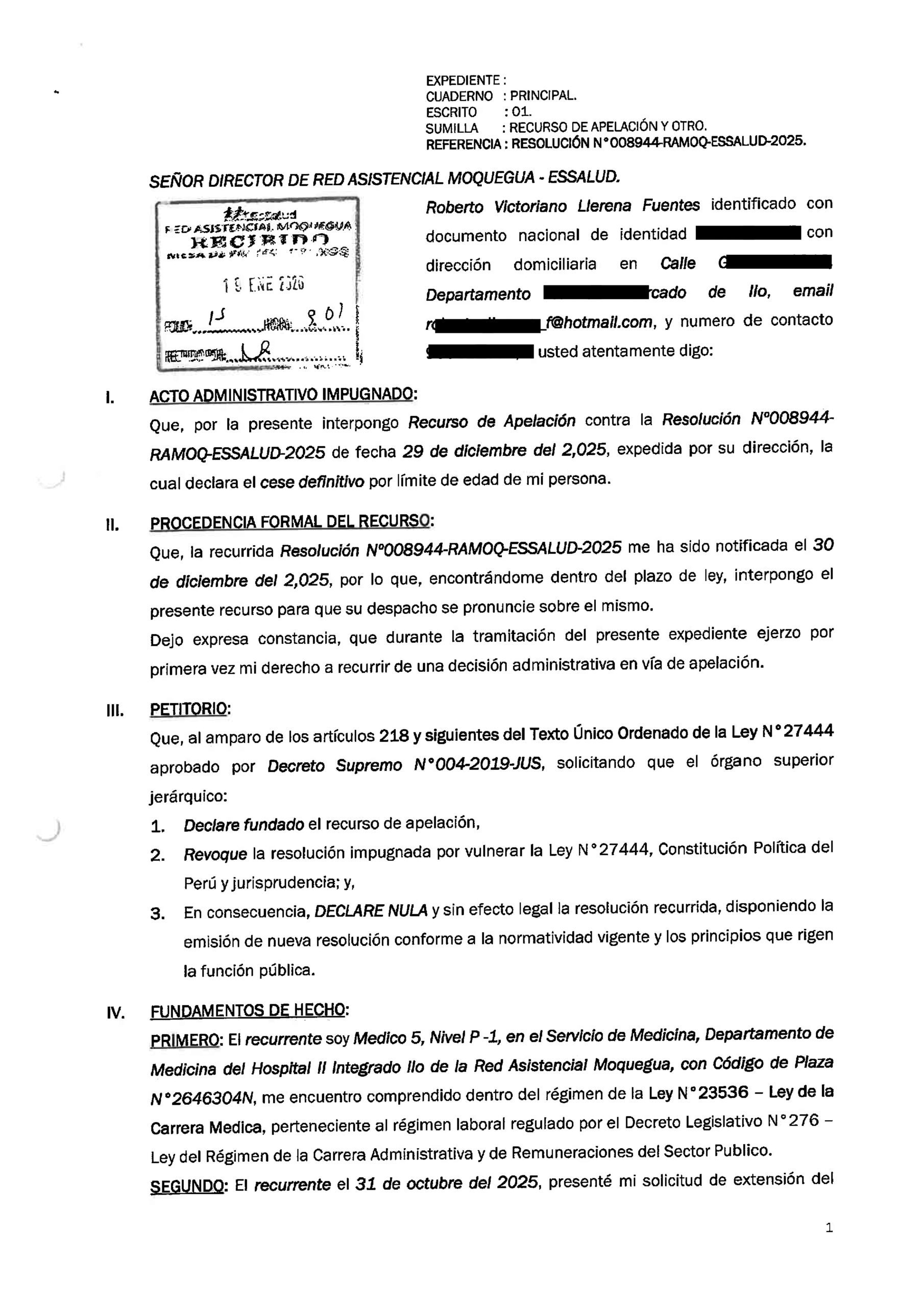 Pese a ello, el 29 de diciembre de 2025 se emitió la Resolución N° 008944-RAMOQ-ESSALUD-2025, notificada el 30 de diciembre, declarando su cese definitivo a partir del 31 de diciembre de 2025.