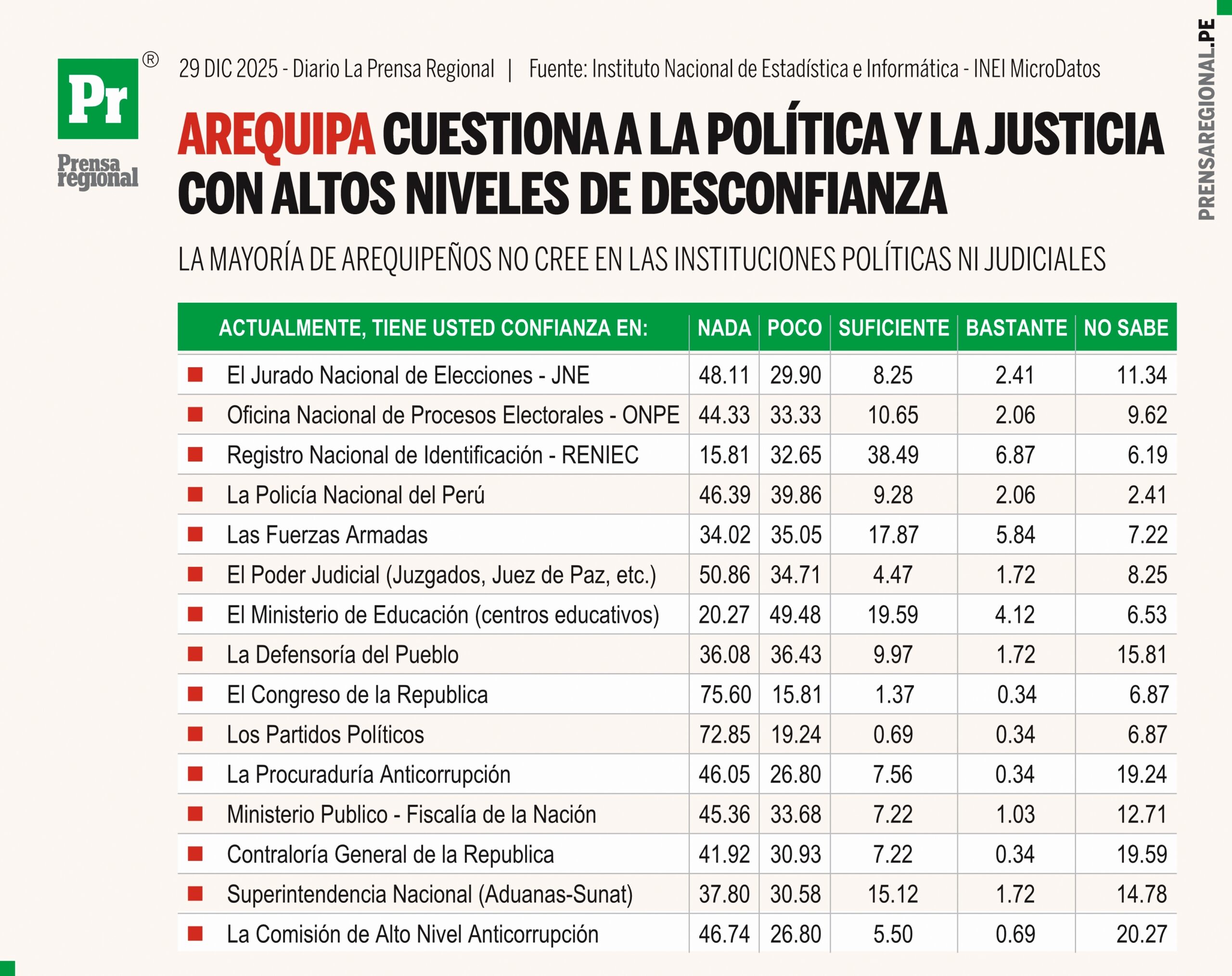 Este resultado confirma una ruptura profunda entre ciudadanía y sistema político, asociada a percepciones de corrupción, falta de representación efectiva y escasa respuesta a las demandas regionales. En Arequipa, región históricamente activa en la protesta social y el control ciudadano, esta desconfianza adquiere una connotación particularmente crítica.
