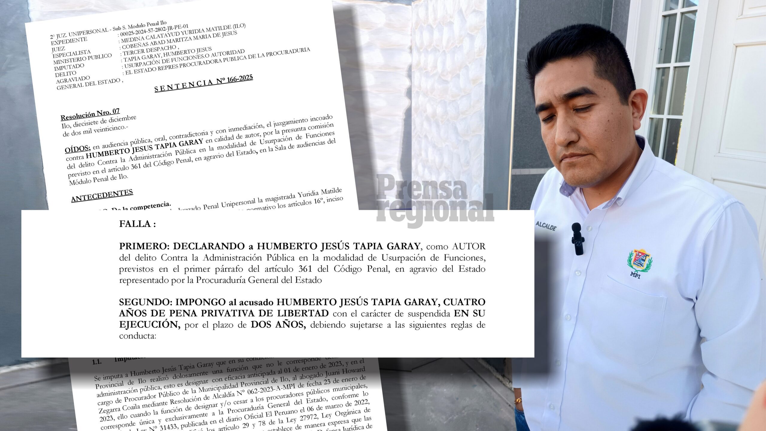 La Unidad de Investigación de Prensa Regional accedió a información de alto interés público que permaneció reservada durante los últimos días de diciembre, con la finalidad de cerrar el año 2025. Se trata de una sentencia en primera instancia que condena al alcalde de la Municipalidad Provincial de Ilo, Humberto Tapia Garay, como autor del delito de usurpación de funciones.
