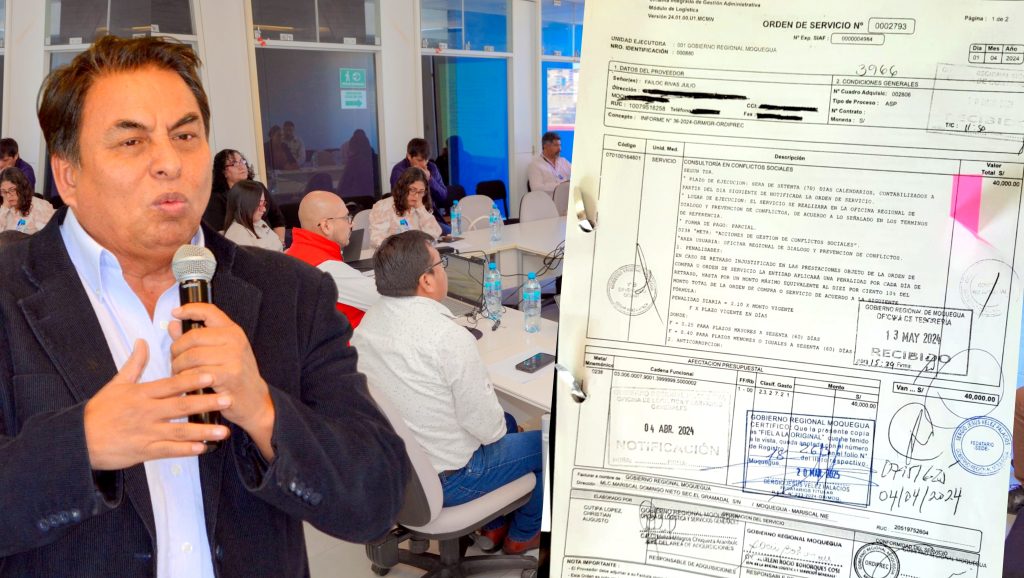 Maldonado informó que Failoc Rivas también figura como asesor FAG (Fondo de Apoyo Gerencial), con ingresos mensuales de entre S/ 5,000 y S/ 8,000. A ello se suma una orden de servicio N.º 0002793 emitida el 1 de abril de 2024, por la supuesta consultoría en conflictos sociales valorizada en S/ 40,000.