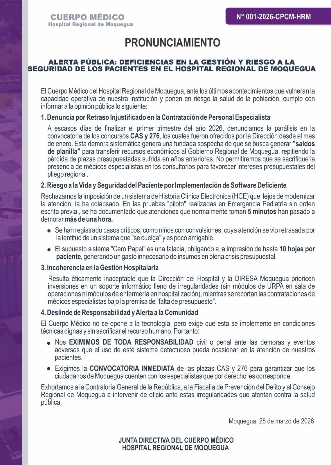 Finalmente, exigieron la convocatoria inmediata de las plazas CAS y 276 para garantizar la presencia de especialistas, y exhortaron a la Contraloría General de la República del Perú, al Ministerio Público a través de la Fiscalía de Prevención del Delito, y al Consejo Regional de Moquegua a intervenir de oficio ante estas presuntas irregularidades que, según remarcan, atentan contra la salud pública.