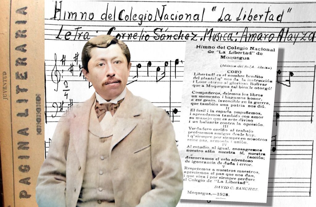 Ese mismo año, en la instalación de la Escuela Dominical, lee la festejada poesía «La grande obra». Tiempo después sería autor de la letra del himno de este plantel con la melodía del profesor de música Amaro Alayza Tapia, canción que hasta hoy entona la comunidad estudiantil bolivariana.