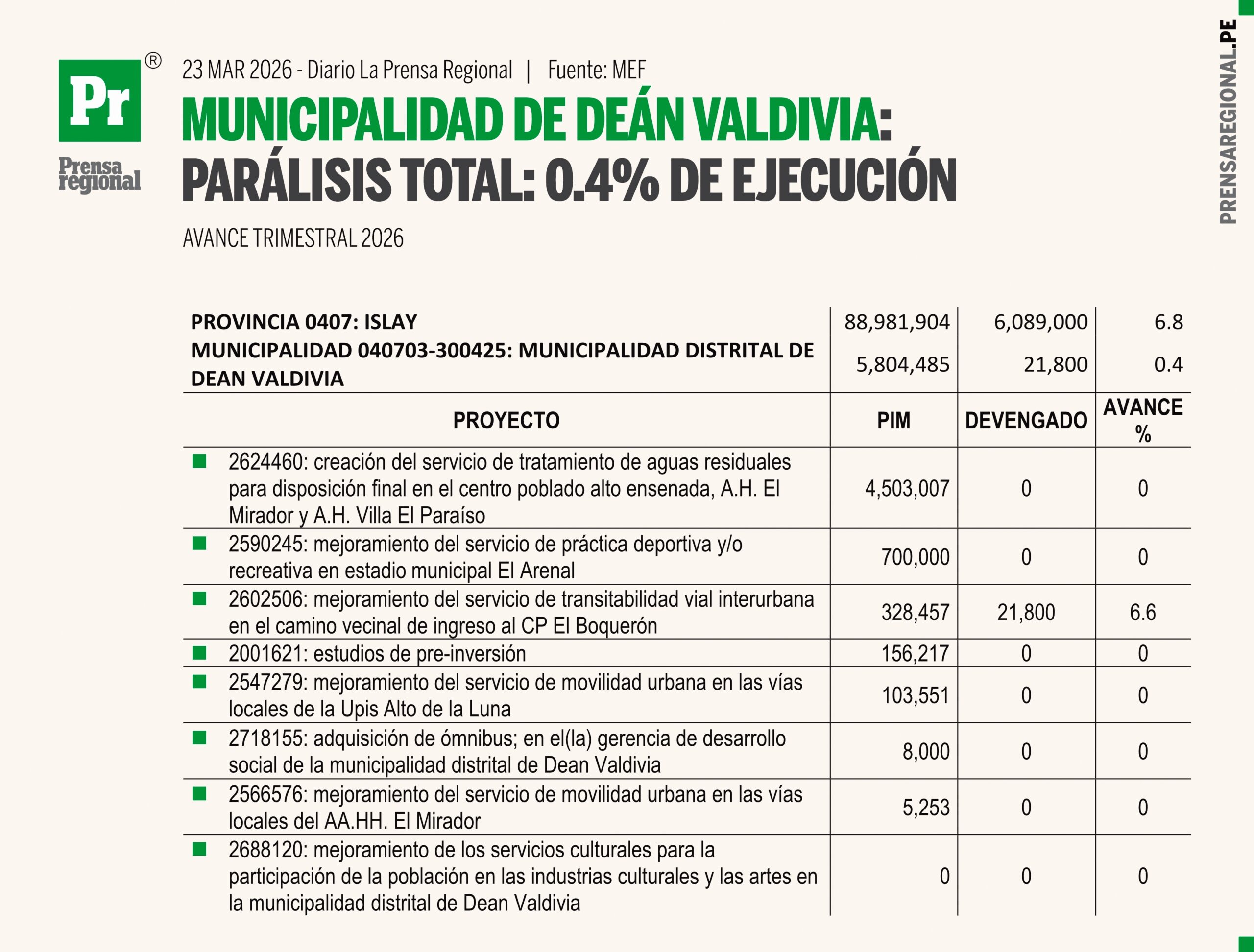 El panorama de la inversión pública en la Municipalidad Distrital de Deán Valdivia es técnicamente preocupante.