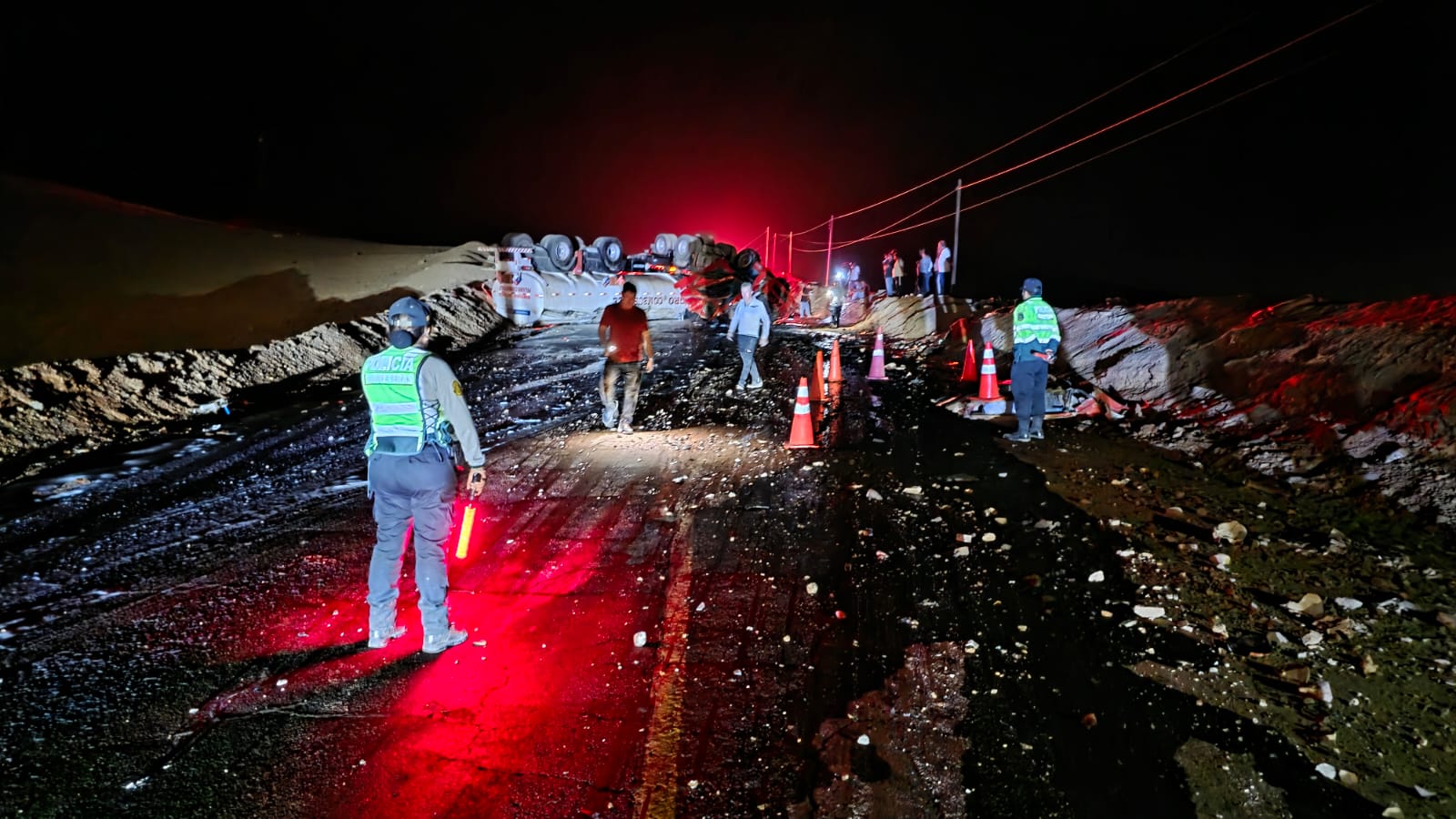 El vehículo siniestrado es un tracto camión de placa 4154-GLC, de color rojo y blanco, que transportaba combustible diésel. La cabina quedó con la parte frontal totalmente abollada, mientras que el remolque cisterna presentó múltiples daños materiales que serán determinados por personal especializado.