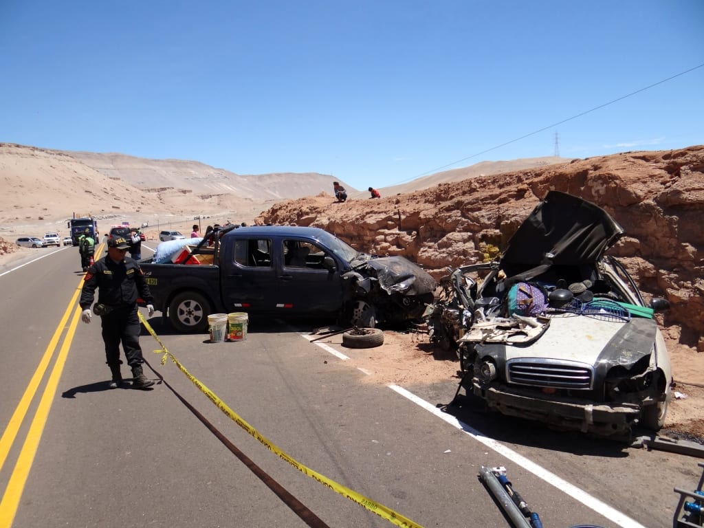 El violento choque frontal, se suscitó en el kilómetro 1174 al final del valle de Moquegua, entre el vehículo que hace el servicio colectivo de placa Z3O-506 marca Hyundai, modelo Sonata, color plata de la empresa de Transportes Turismo y Servicios Generales Mar y Sol SRL que hacía la ruta Ilo- Moquegua y la camioneta marca Nissan 4×4 color azul de matrícula Z4I-839 que partió de Puno con dirección a Ilo.