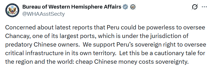 “Apoyamos el derecho soberano de Perú a supervisar infraestructura crítica en su propio territorio. Que esto sirva de advertencia para la región y el mundo: el dinero barato chino cuesta soberanía”, advirtió la entidad estadounidense.