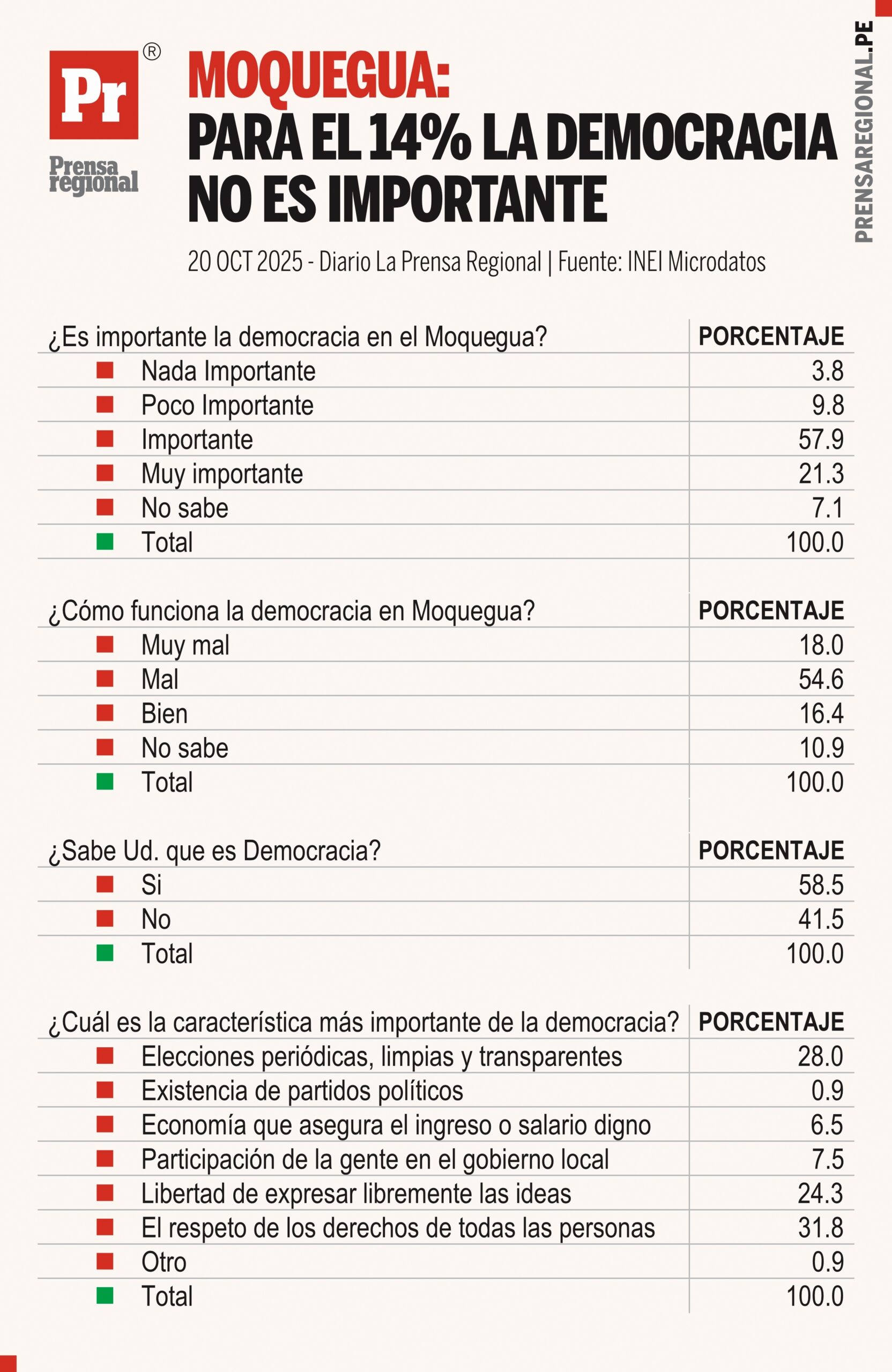 De acuerdo con la encuesta del INEI sobre percepción democrática, el 79.2% de los ciudadanos de Moquegua considera que la democracia es “importante” o “muy importante”, mientras que solo un 13.6% la percibe como poco o nada importante.