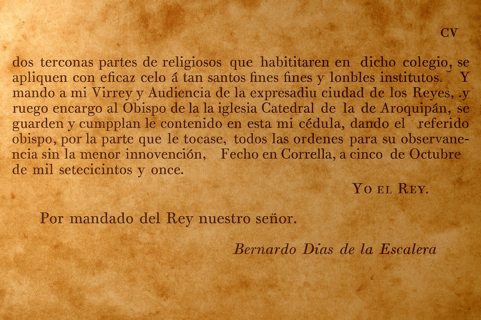 Su regia majestad Felipe V, que acompañado de la augusta familia trasladó toda la corte a Corella, al sur de Navarra, no tarda en acoger tan justos y repetidos ruegos de sus súbditos de la villa de Moquegua, y el 5 de octubre de 1711 con soberano beneplácito expide la cédula real por la que ordena “doy y concedo licencia a la Compañía de Jesús para que pueda fundar un colegio en la villa de Moquegua, con las haciendas que donó para este fin don Joseph Hurtado Ichagoyen, para la crianza y educación de la juventud y enseñanza de las primeras letras de todo aquel obispado, que será de mucho bien espiritual a mis súbditos, que tanto lo han deseado y desean”, más aun considerando que para su funcionamiento no se vería afectada con gravamen alguno su real hacienda, pues el fundador la dotaba de los bienes necesarios.