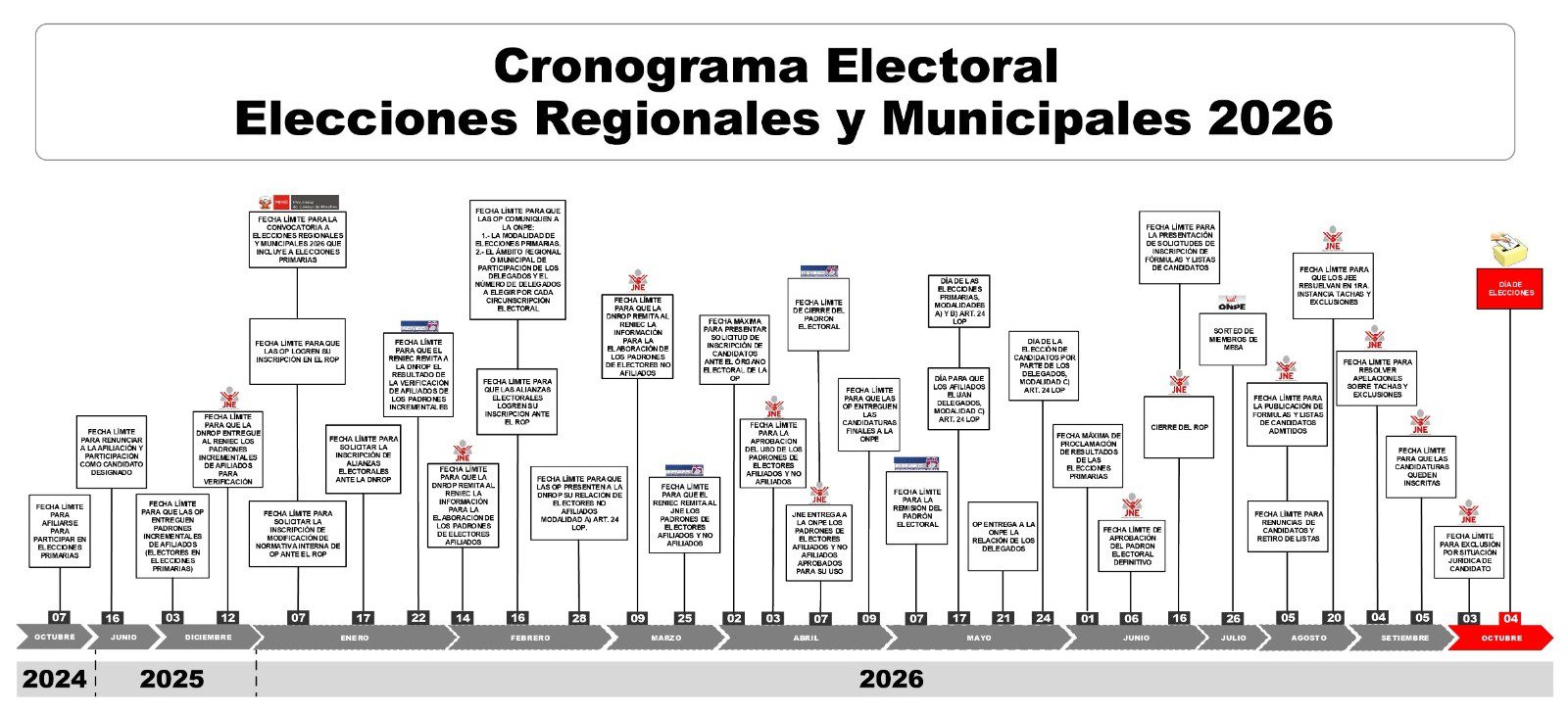 El Pleno del Jurado Nacional de Elecciones (JNE) aprobó el cronograma electoral que regirá en las Elecciones Regionales y Municipales 2026 (ERM 2026). Dicha línea de tiempo detalla las fechas límites y plazos que deberán cumplir las entidades del sistema electoral y los partidos políticos y movimientos regionales que participarán en el proceso subnacional.