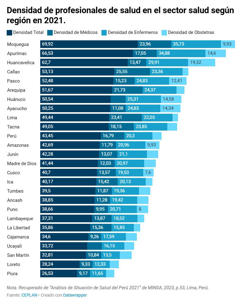 Por otro lado, el Análisis de Situación de Salud (ASIS) nacional del Ministerio de Salud, correspondiente a 2021, informó que la densidad de profesionales de la salud (DPS) fue de 43.5 por cada 10,000 habitantes, de los cuales 16.8 correspondían a médicos. No obstante, se trata de un dato previo a las actualizaciones administrativas más recientes.