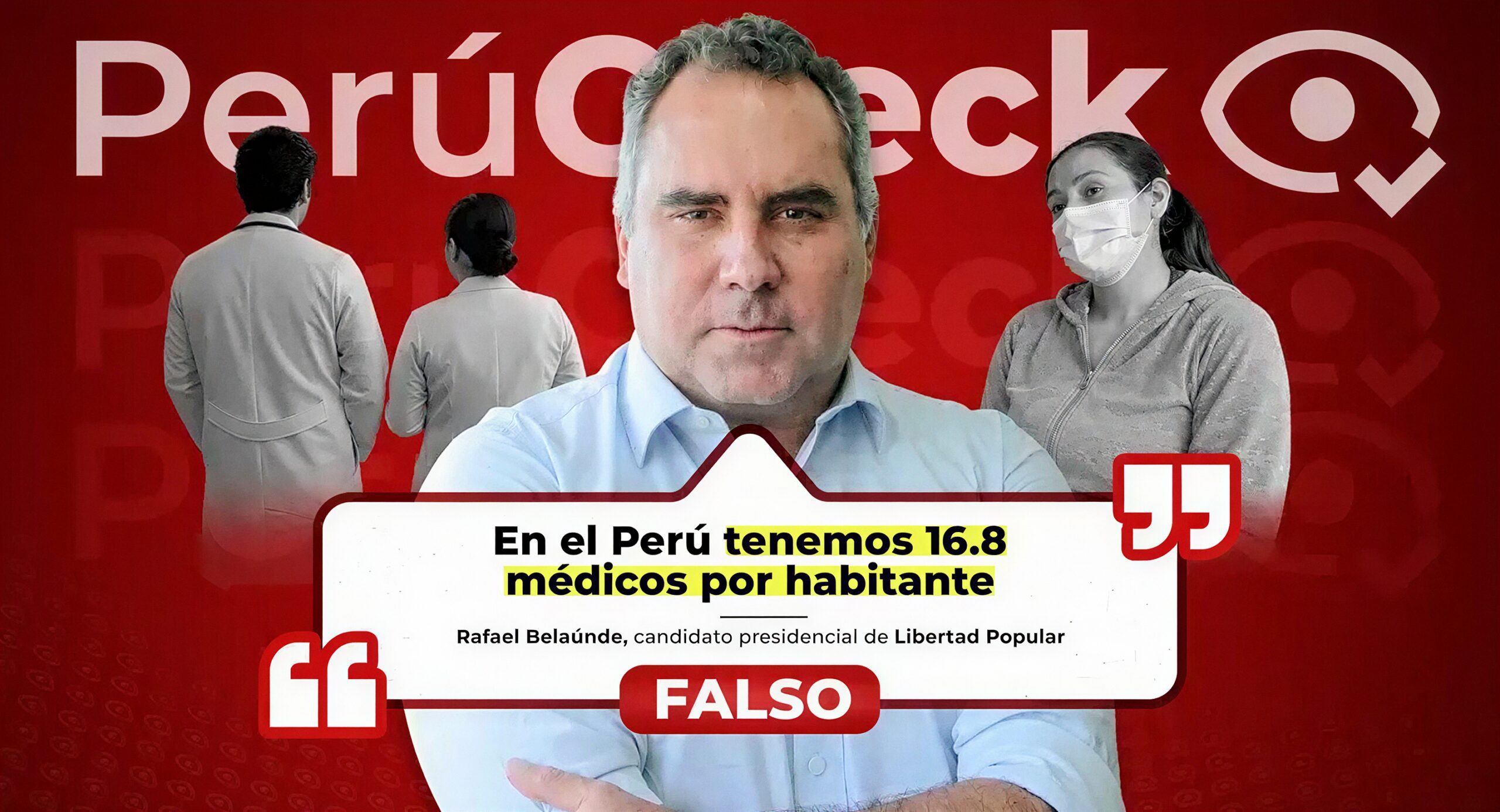 La información administrativa más reciente del Ministerio de Salud reporta 17.9 médicos por cada 10,000 habitantes a octubre de 2025. El candidato de Libertad Popular, Rafael Belaúnde, señaló que en el país existen 16.8 médicos por cada habitante. Aun cuando se haya querido referir a la unidad de medida de médicos por 10,000 habitantes –pues en un país de 34 millones de personas no puede haber 500 millones de médicos–, la cifra dada por Belaúnde es errada, pues diversos otros estudios demuestran estadísticas distintas. Por lo tanto, PerúCheck califica la declaración del candidato como falsa.