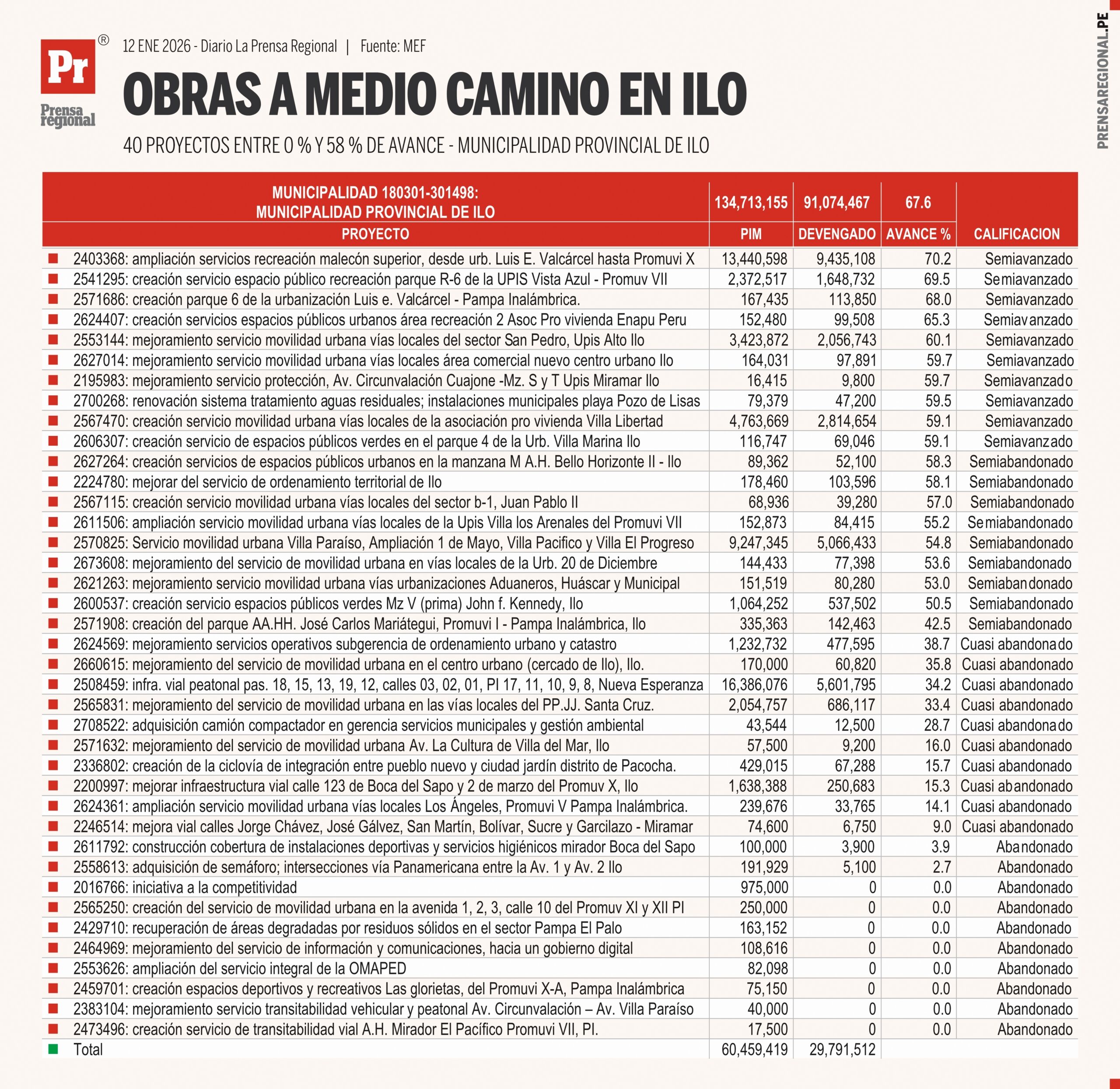 La Municipalidad Provincial de Ilo registró en 2025 un Presupuesto Institucional Modificado (PIM) de S/ 134.7 millones (ciento treinta y cuatro millones setecientos mil soles), con un devengado de S/ 91.1 millones (noventa y un millones cien mil soles), lo que equivale a una ejecución global de 67.6 %. Sin embargo, al interior de esta cifra agregada se identifican cuarenta (40) proyectos con niveles de ejecución por debajo del 58 %, evidenciando un desempeño claramente insuficiente para un gobierno local con una amplia cartera de inversiones.