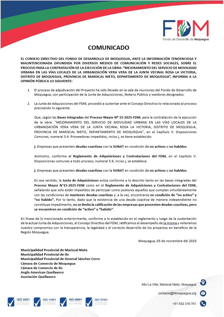 El Fondo de Desarrollo de Moquegua (FDM) emitió un comunicado en respuesta a una supuesta información “tendenciosa y malintencionada” difundida en algunos medios de comunicación sobre el proceso de contratación para la ejecución de la obra “Mejoramiento del servicio de movilidad urbana en las vías locales de la urbanización Vera de la Junta Vecinal Rosa La Victoria”, en Moquegua.