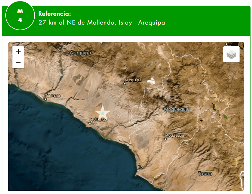 Un sismo de magnitud 4.0 fue registrado a las 14:44 horas de este sábado, con referencia a 27 kilómetros al noreste de Mollendo, en la provincia de Islay.