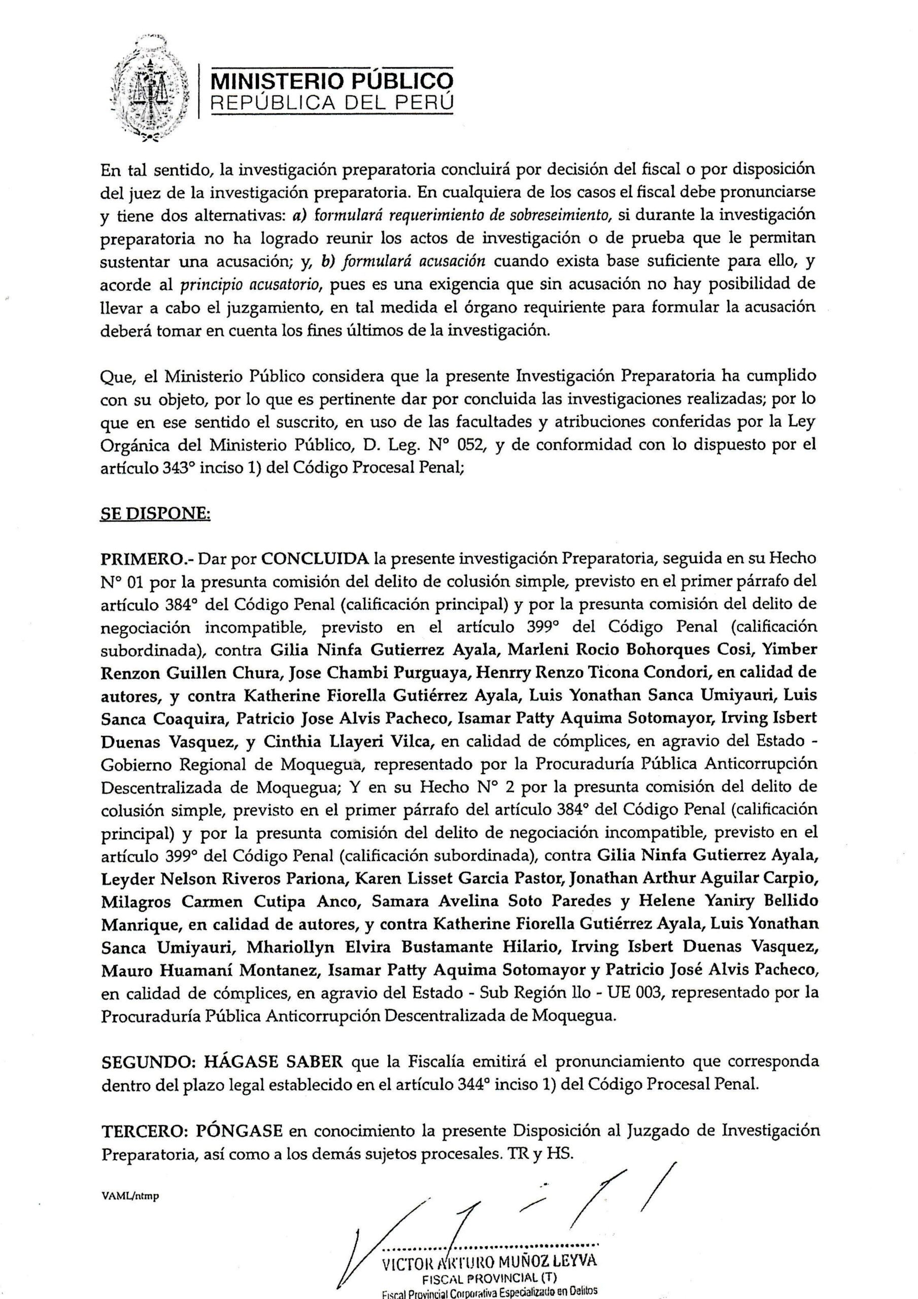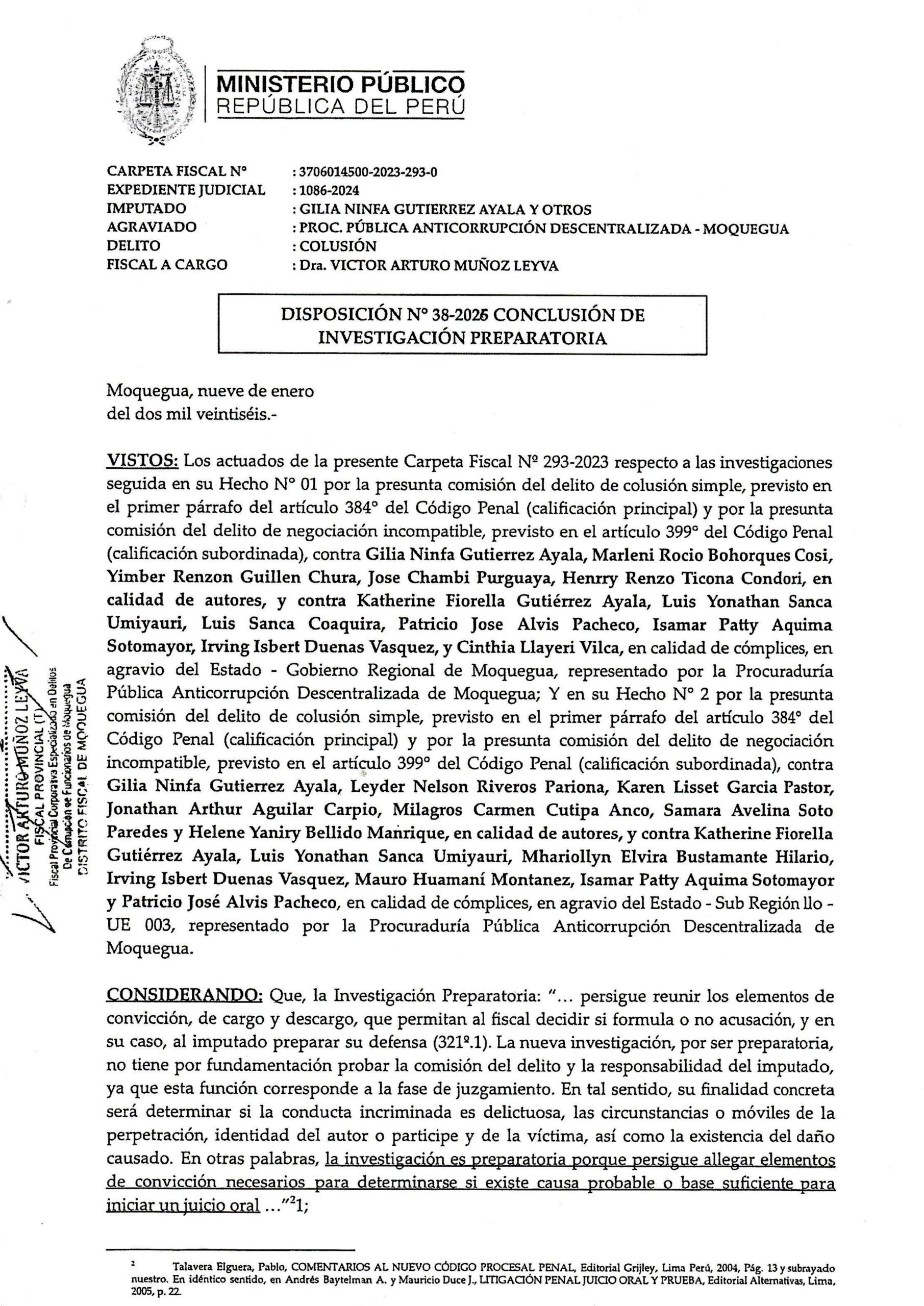 Se trata de la Disposición Fiscal N.º 38-2026, emitida el 9 de enero de 2026 dentro de la Carpeta Fiscal N.º 293-2023, documento que se mantenía hermético y al cual tuvo acceso la Unidad de Investigación de Prensa Regional. Mediante esta disposición, el fiscal Víctor Arturo Muñoz Leyva dispuso dar por concluida la investigación preparatoria seguida contra la primera autoridad regional, su hermana, su cuñadísimo, funcionarios públicos y particulares vinculados a empresas arequipeñas favorecidas con presuntas contrataciones direccionadas.
