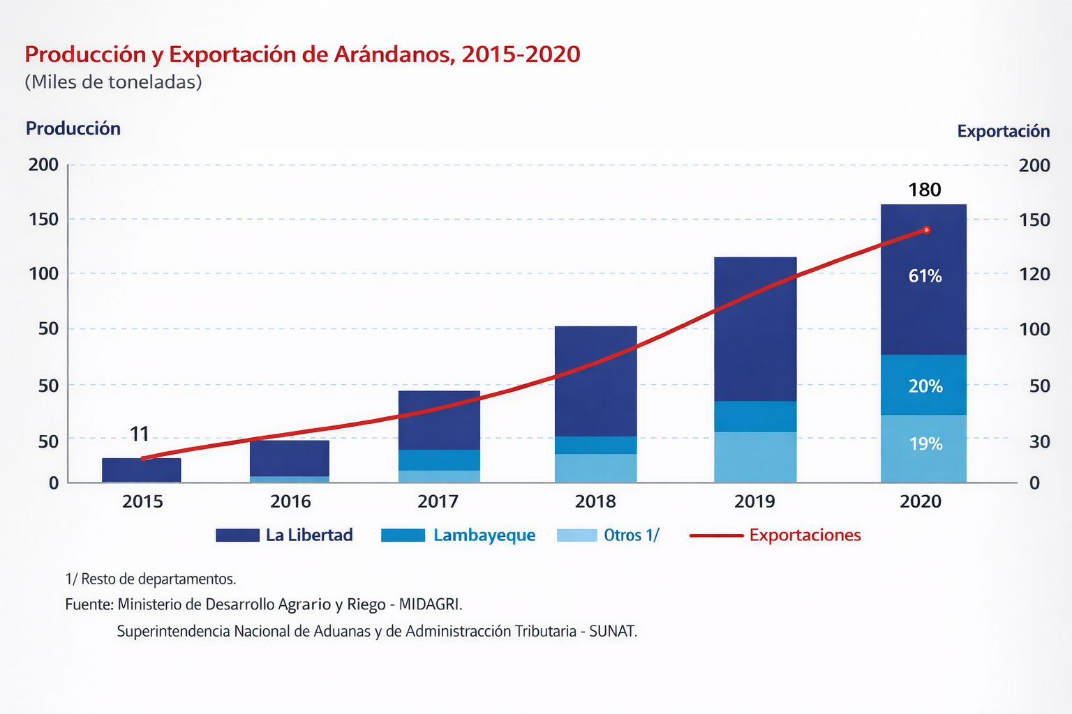 699bfffd950bee6cbf09ff46 La Prensa RegionalEl crecimiento del sector también ha sido reconocido a nivel internacional. El Banco Mundial destacó que las exportaciones de arándanos peruanos pasaron de alrededor de US$30 millones en 2014 –cifra menor a la registrada por la Sunat– a cerca de US$1,000 millones en 2020, impulsadas por la capacidad del país para producir durante todo el año y aprovechar periodos de menor oferta global.