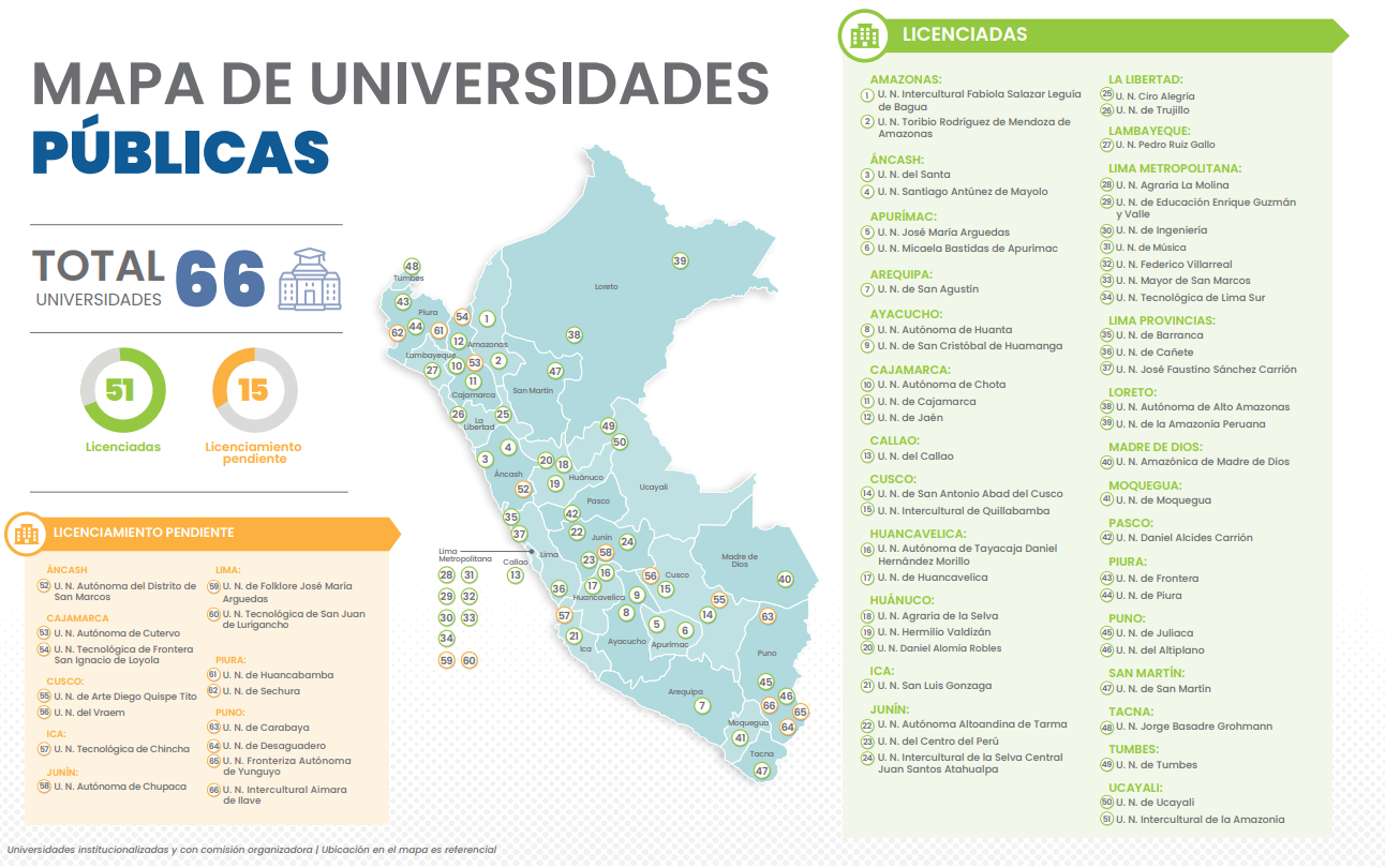Asimismo, según el mapa de universidades públicas del Ministerio de Educación, a nivel nacional existen 66 universidades nacionales distribuidas en todo el territorio peruano, algunas de ellas con licenciamiento pendiente: