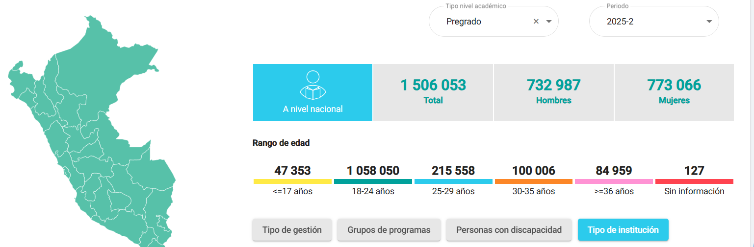 Además el Sistema de Información Universitaria de la Sunedu, informa que actualmente existen más de 1, 418, 991 estudiantes de pregrado repartidos en todas las regiones de nuestro país, cifras actualizadas al 2025 – II.