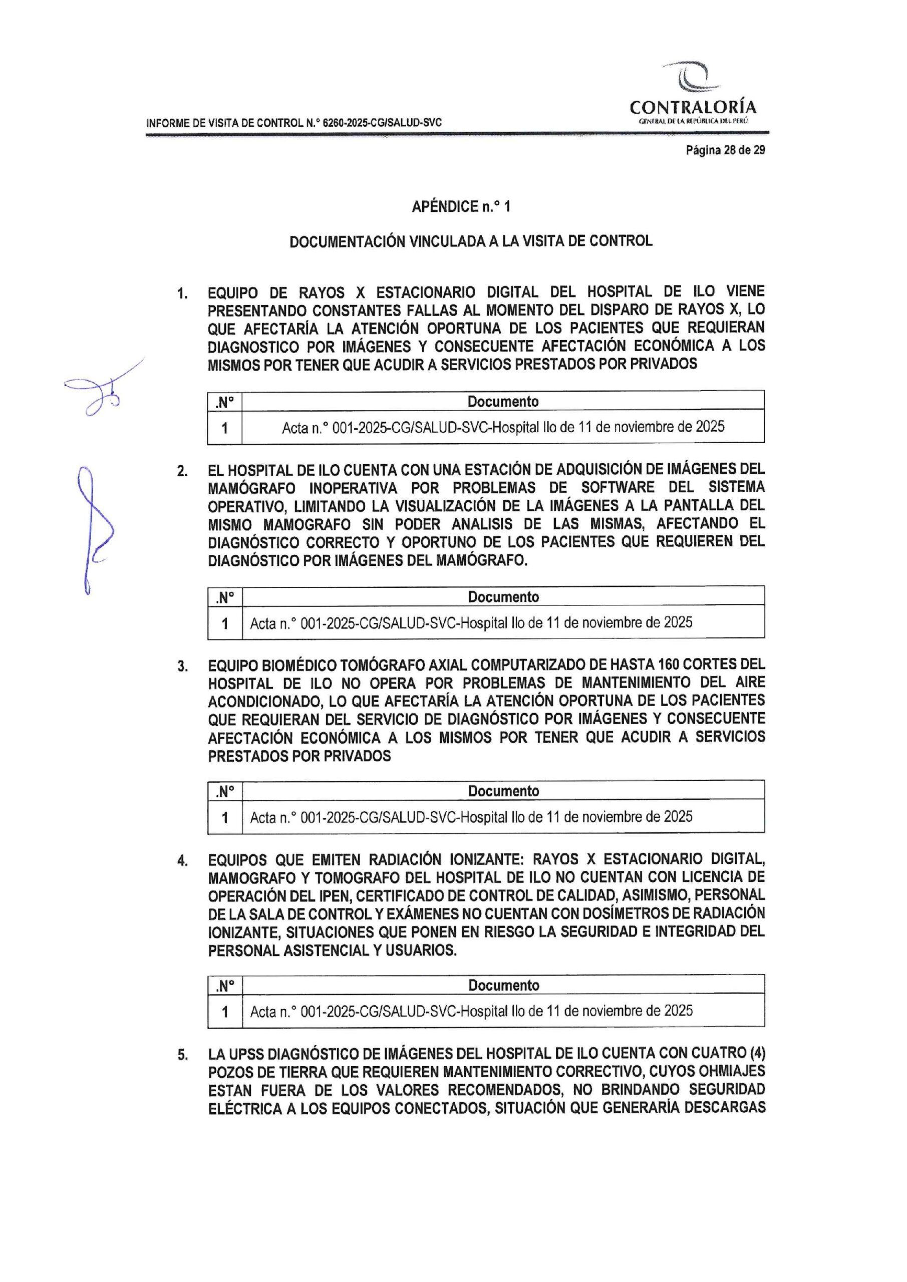 El Informe de Visita de Control N.° 25762-2025-CG/SALUD-SVC, elaborado por la Subgerencia de Control del Sector Salud de la Contraloría General de la República, evaluó la operatividad de los servicios priorizados del Hospital de Ilo, en el distrito y provincia de Ilo, departamento de Moquegua, durante el período comprendido entre el 10 de noviembre y el 03 de diciembre de 2025. El documento fue emitido el 12 de diciembre de 2025 y recoge constataciones técnicas directas realizadas en las instalaciones del establecimiento de salud.