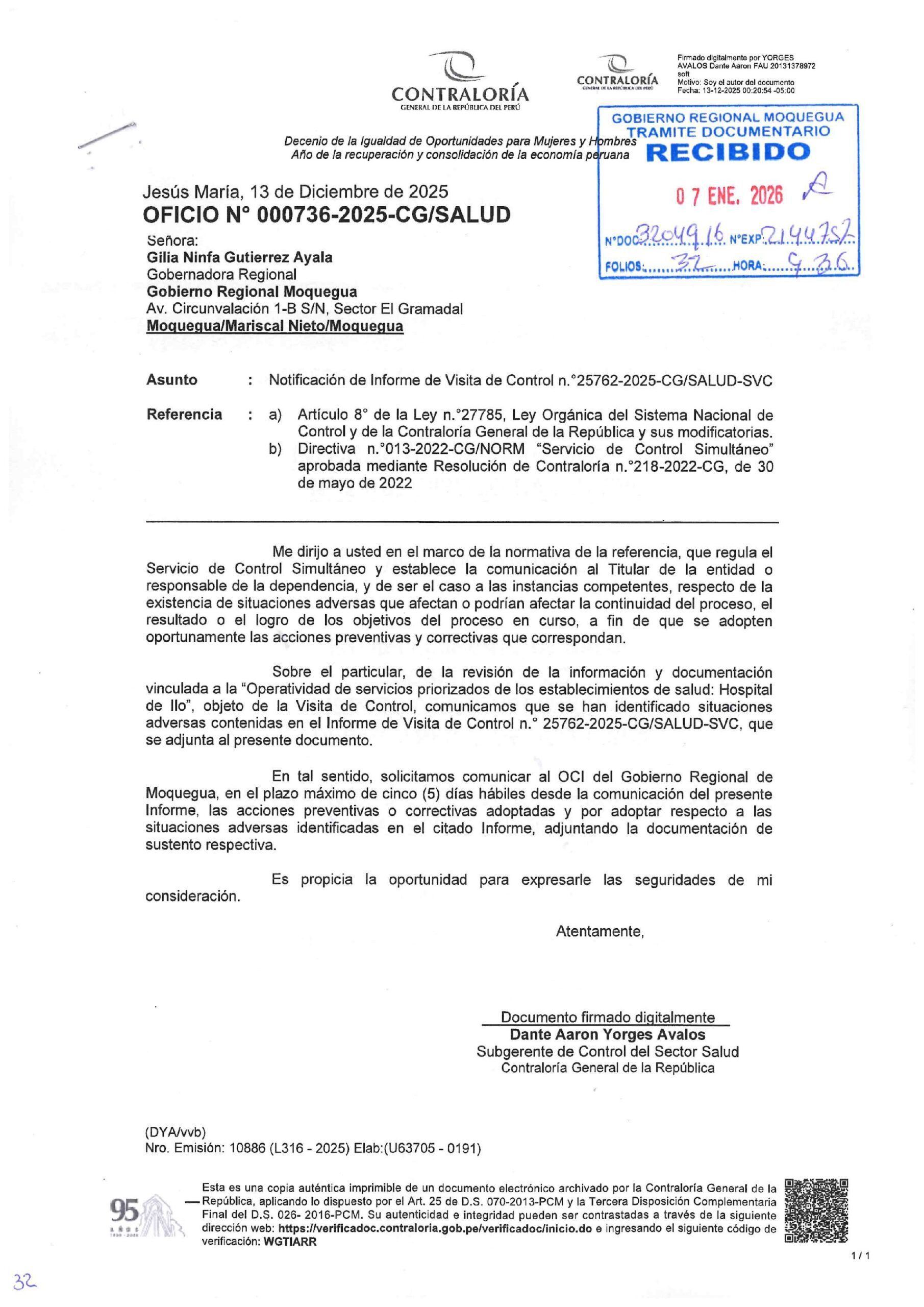 Todas las situaciones adversas consignadas por la Contraloría fueron verificadas durante el año 2025, bajo la responsabilidad administrativa y política del Gobierno Regional de Moquegua, entidad a la que pertenece el Hospital de Ilo.