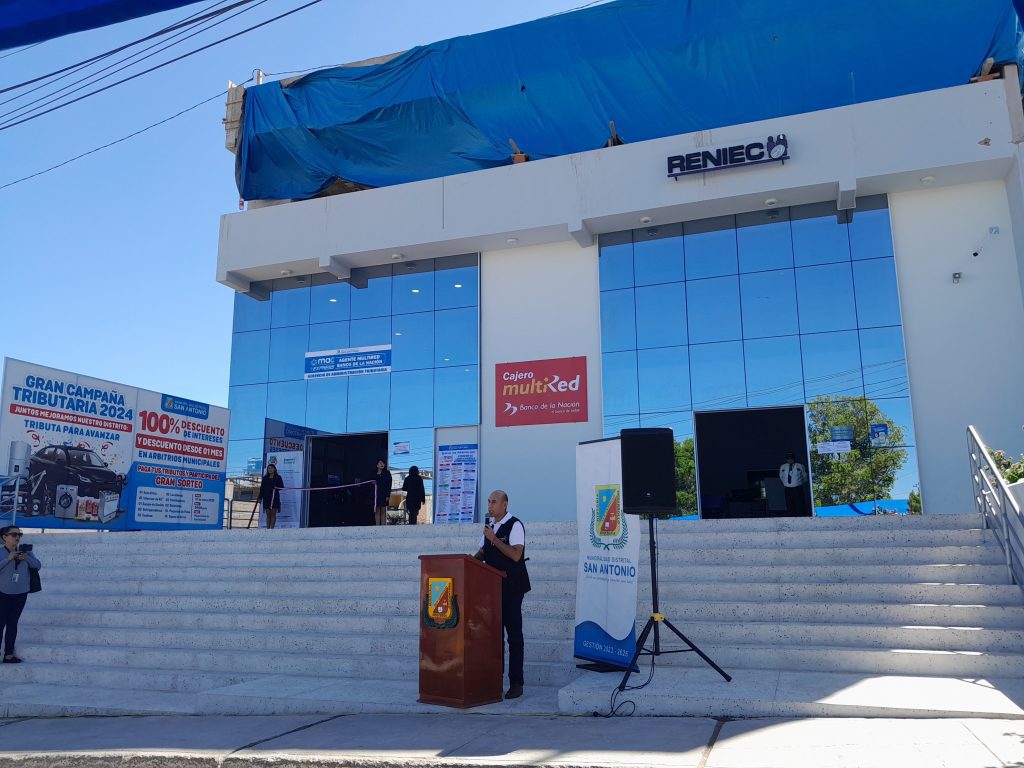 Se llevó a cabo la ceremonia de inauguración oficial del Mac Express en el distrito de San Antonio, una plataforma que estará al servicio de la población para realizar todo tipo de trámites. Ahora se cuenta con un agente Multi Red del Banco de la Nación, el agente virtual de la SUNARP y el RENIEC, los cuales estarán a disposición de la población, además de la Gerencia de Administración Tributaria.