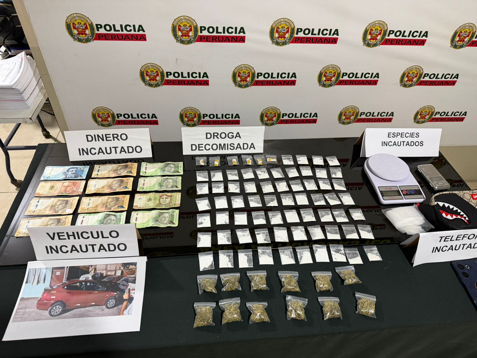 En el operativo se incautó un vehículo de placa Z5M-165, marca Hyundai, color rojo. Asimismo, durante el registro personal, los efectivos hallaron en el interior de un canguro, que llevaba puesto, 20 bolsitas tipo ziploc con clorhidrato de cocaína, 10 bolsitas de plástico con marihuana y un teléfono celular.