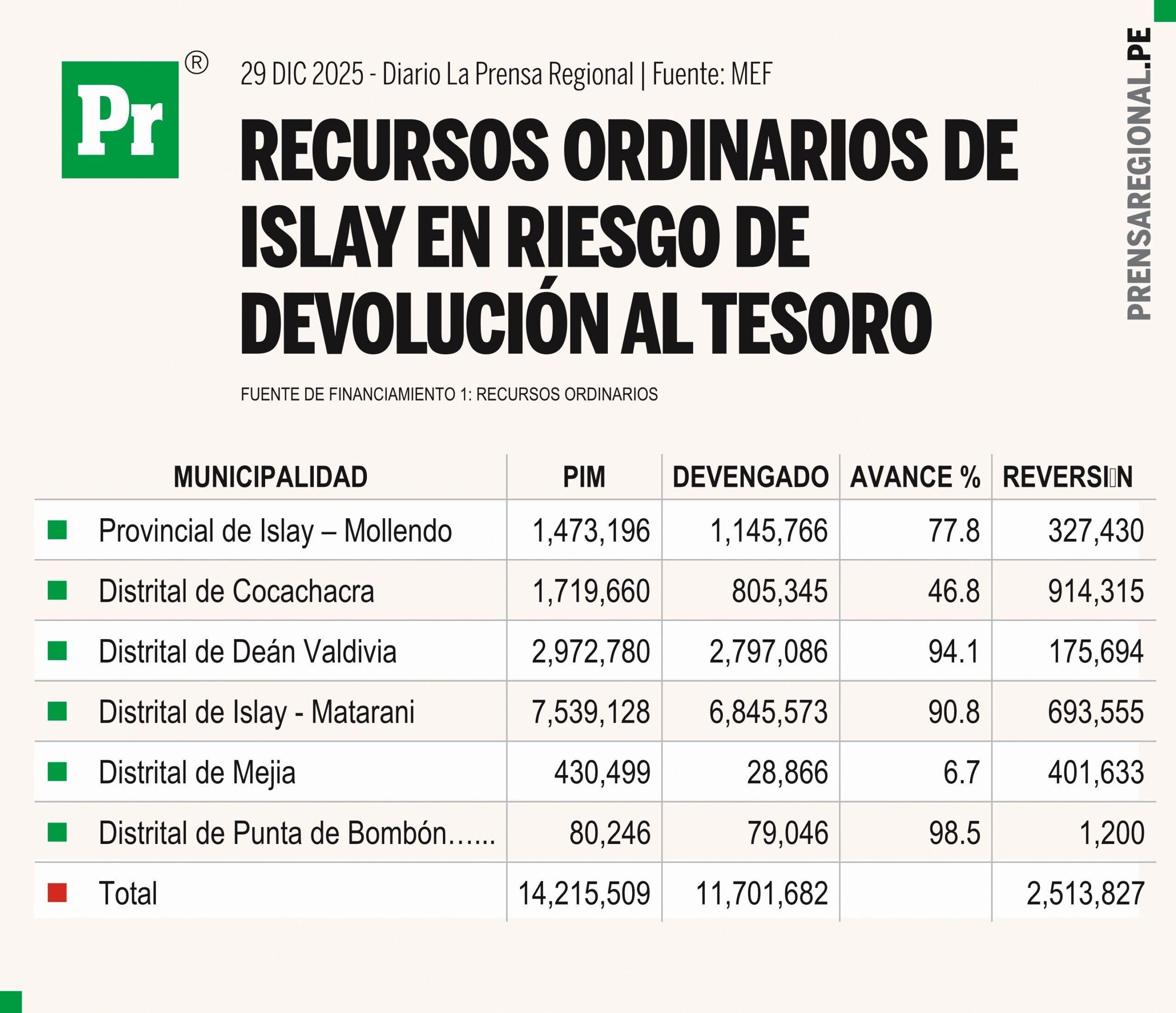 En conjunto, la provincia de Islay enfrenta el riesgo de revertir S/ 2,51 millones en Recursos Ordinarios. La información muestra que, más allá del promedio provincial, las brechas de ejecución se concentran en determinados municipios, lo que evidencia diferencias significativas en capacidad de gestión, programación y control del gasto público local.