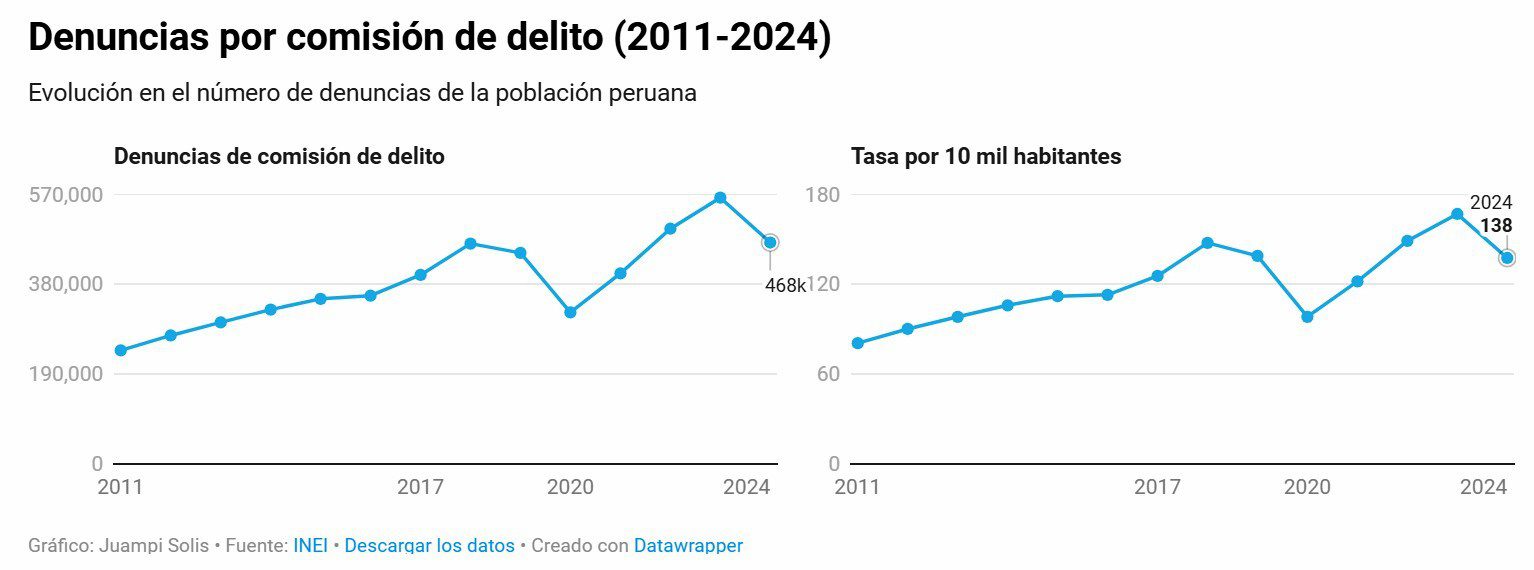 PerúCheck también revisó el consolidado de denuncias policiales 2011-2017 y 2018-2024Halló el inicio de una tendencia al alza en las denuncias en 2017. Ese año se registraron 400,000 denuncias, 12% más que en 2016.