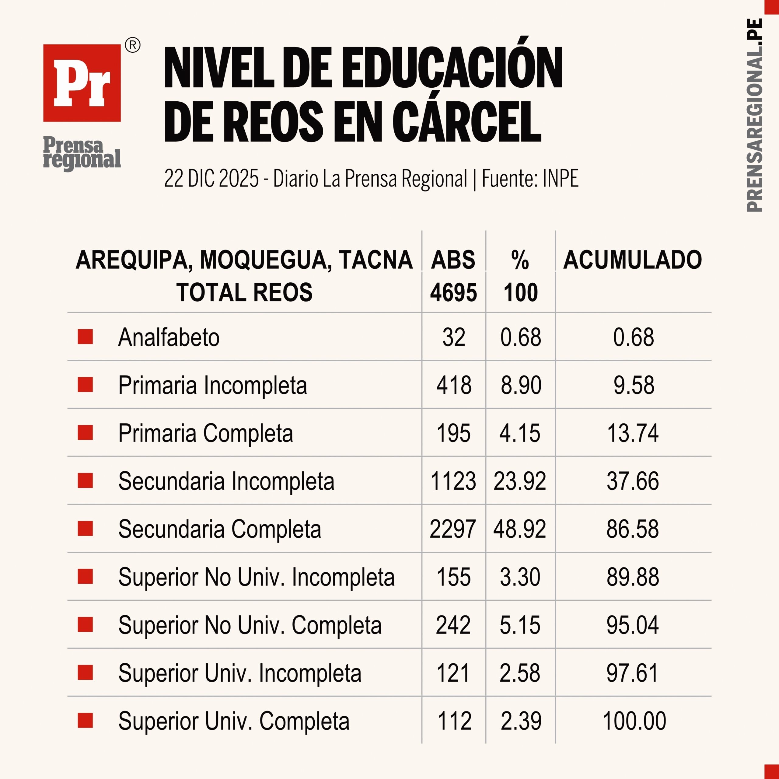 Del total de 4 695 ingresantes a las cárceles del sur costero peruano, la gran mayoría se concentra en los niveles de educación primaria y secundaria, completas o incompletas. En conjunto, estos niveles explican aproximadamente el 86 % del total de internos, destacando la secundaria completa (2 297 personas, cerca del 49 %) y la secundaria incompleta (1 123 personas, alrededor del 24 %).