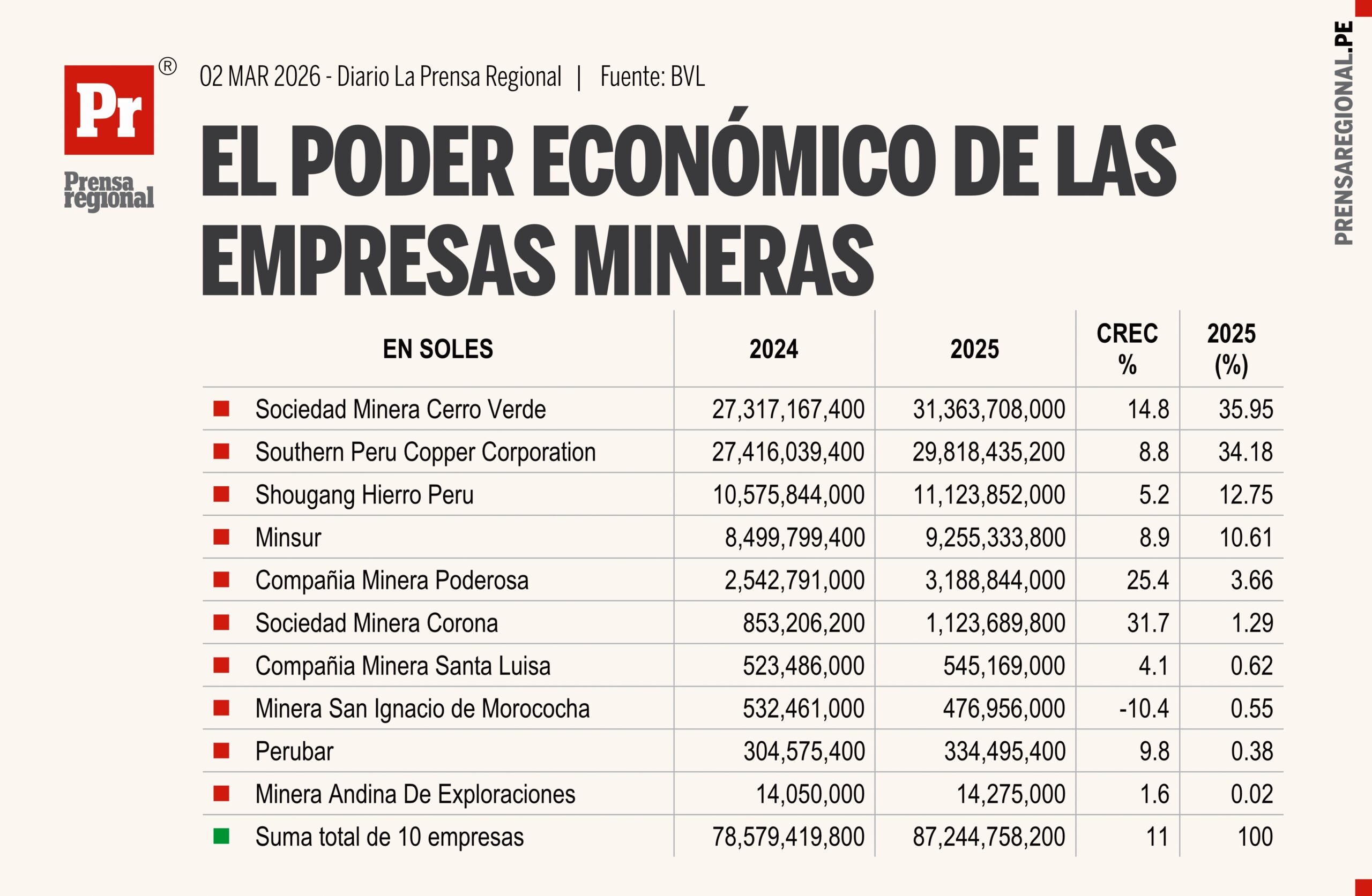 En términos de crecimiento, Cerro Verde registra expansión de 14.8% y Southern de 8.8%. Destacan también Poderosa con 25.4% y Corona con 31.7%, lo que refleja ampliación de operaciones, reposición de activos, inversiones en planta y equipo y/o revalorización patrimonial vinculada a expectativas de flujo futuro.