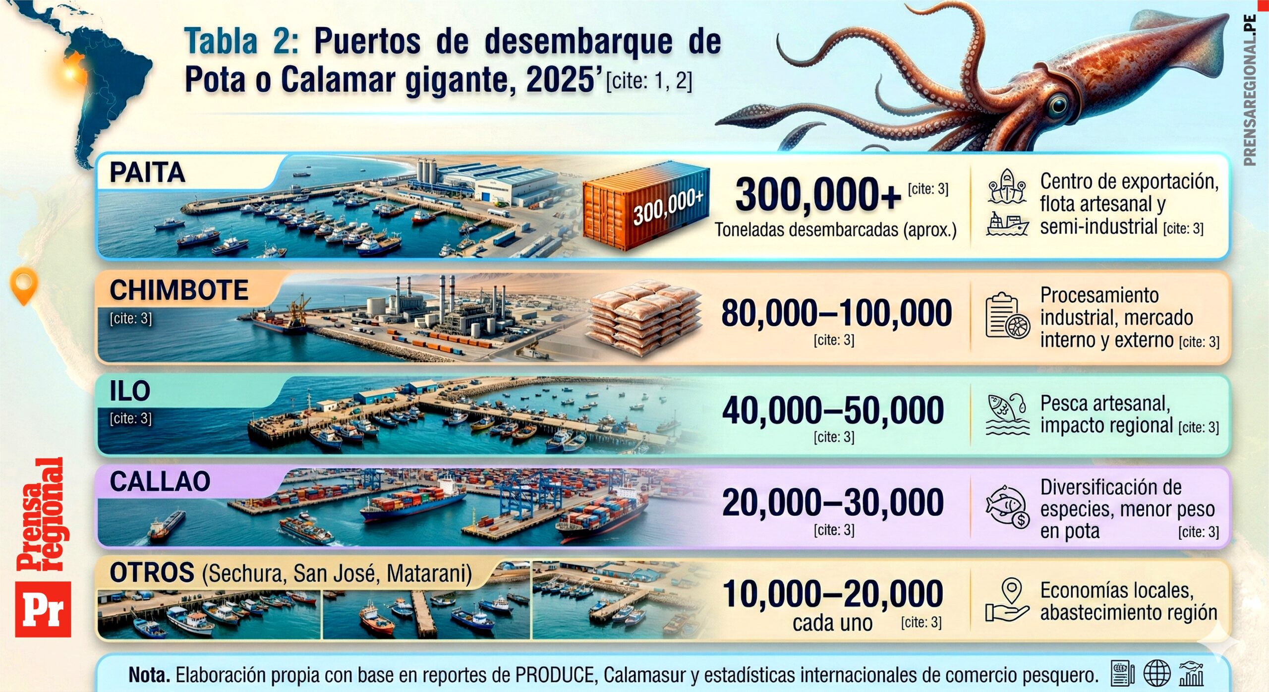 La pota representa más del 60% de las exportaciones pesqueras artesanales del país y concentra su desembarque en puertos como Paita, Chimbote e Ilo, donde comunidades enteras dependen de ella para subsistir. El sur del Perú, con Ilo y Matarani, aporta una cuota significativa, aunque menor que la del norte, donde Paita aporta alrededor del 40%, lo que muestra que esta pesquería es verdaderamente nacional.