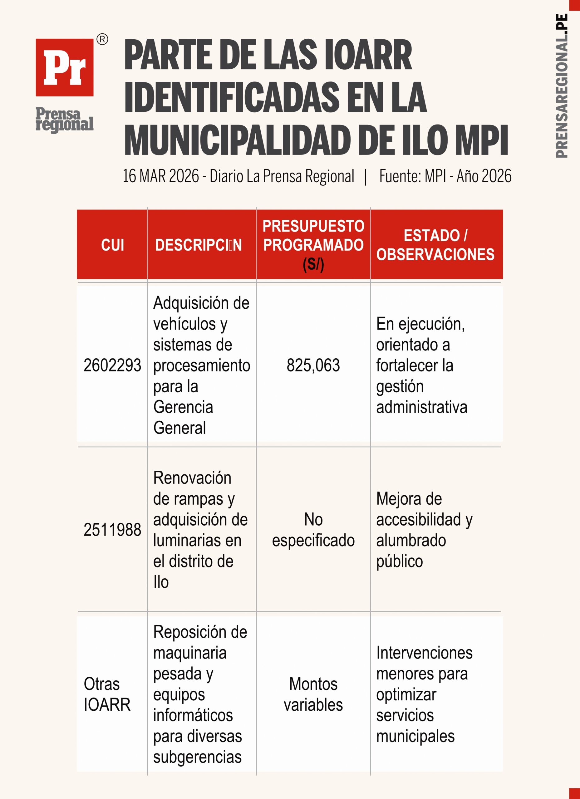 No obstante, presentan serias limitaciones: fichas poco objetivas, fragmentación del gasto en múltiples obras menores, transparencia insuficiente en plataformas como SEACE y repetición de proveedores que genera sospechas de direccionamiento. En Ilo, de un presupuesto municipal de S/161 millones en 2025, las IOARR representan una fracción significativa, pero su manejo aparece mediatizado y con escasa información pública.