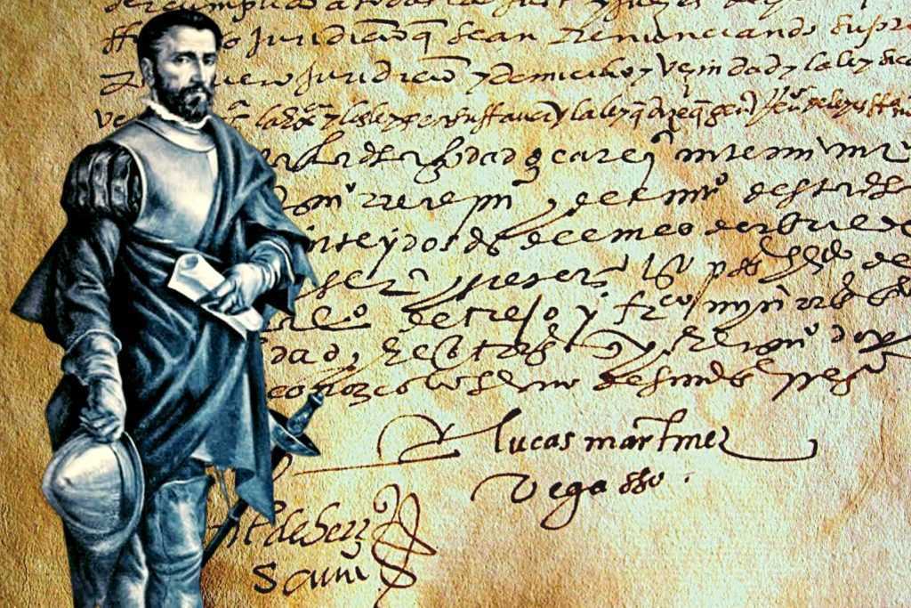 Lucas Martínez nació en Trujillo de Extremadura entre 1511 y 1512; fue hijo de Francisco Martínez Vegazo y Francisca de Valencia. A los 19 años se embarcó hacia las Indias junto a los hermanos Pizarro. Su condición de soldado de a pie estaba expuesta a mayores dificultades y recibía una paga mínima cuando se trataba de repartir oro y plata. En Coaque, por ejemplo, solo recibió 14 pesos.