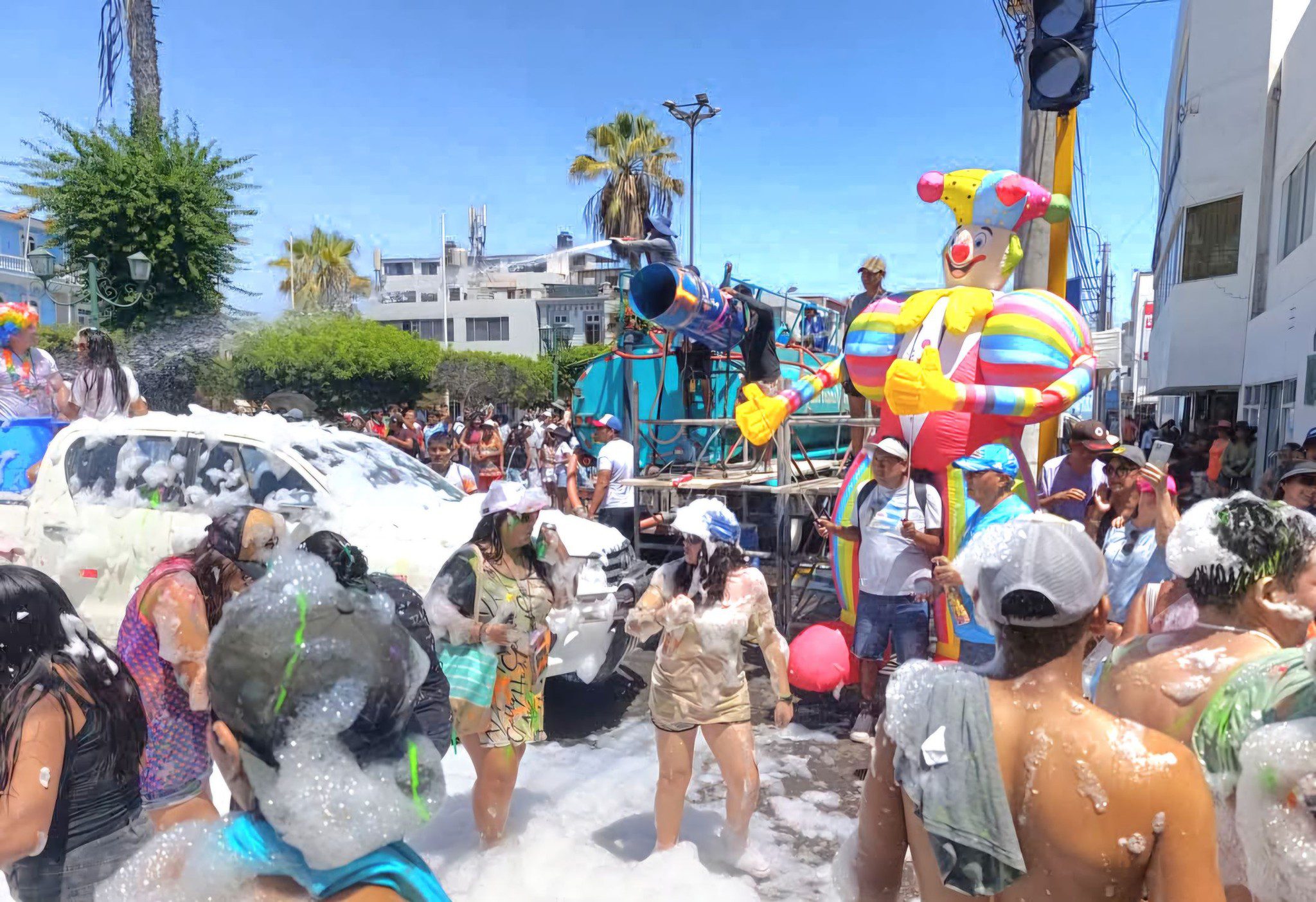 Los grupos “Las Gaviotas” y “Pueblo de Mejía” protagonizaron el enfrentamiento simbólico, en el que globos con agua marcaron la dinámica del encuentro. La actividad se desarrolló sin incidentes y contó con presencia de público en los alrededores de la plaza.