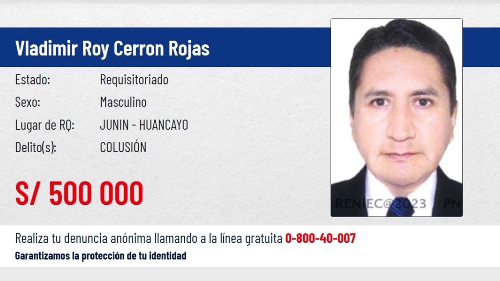 El Ministerio del Interior (Mininter) aprobó aumentar a medio millón de soles el monto de la recompensa ofrecida a quienes brinden información que facilite la ubicación o captura de Vladimir Cerrón, y de otros cuatro prófugos de la justicia.