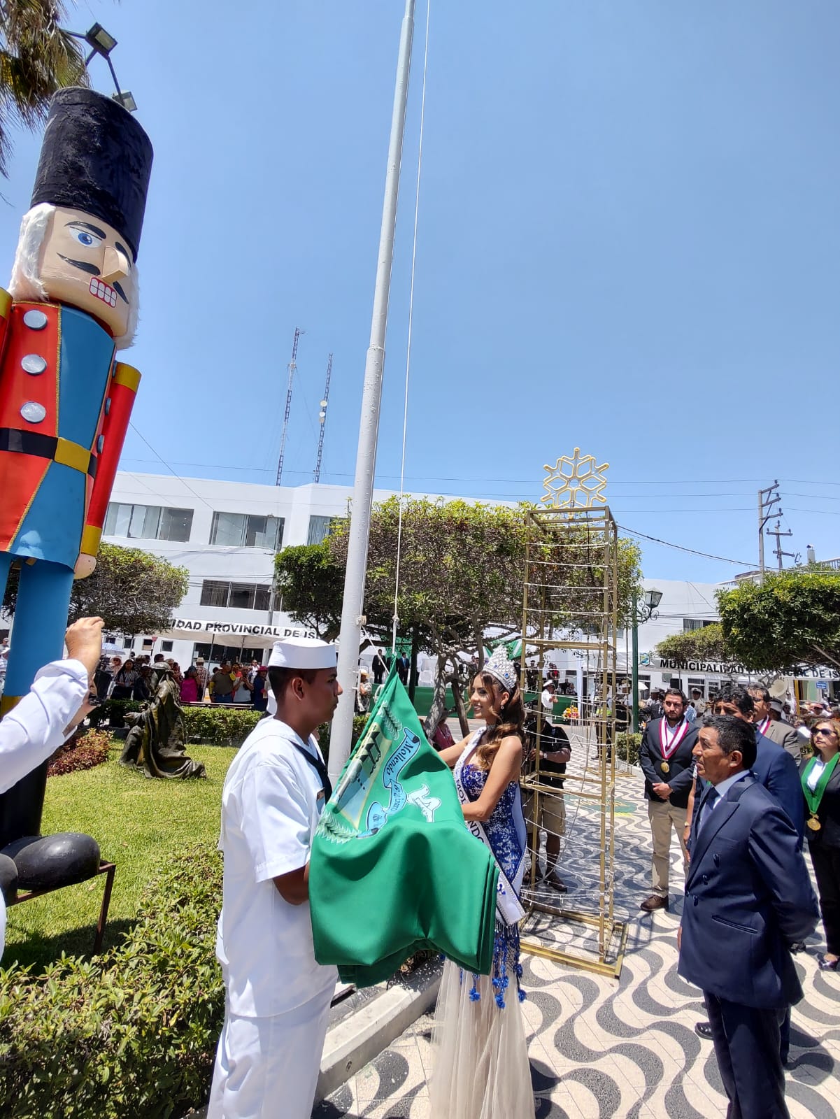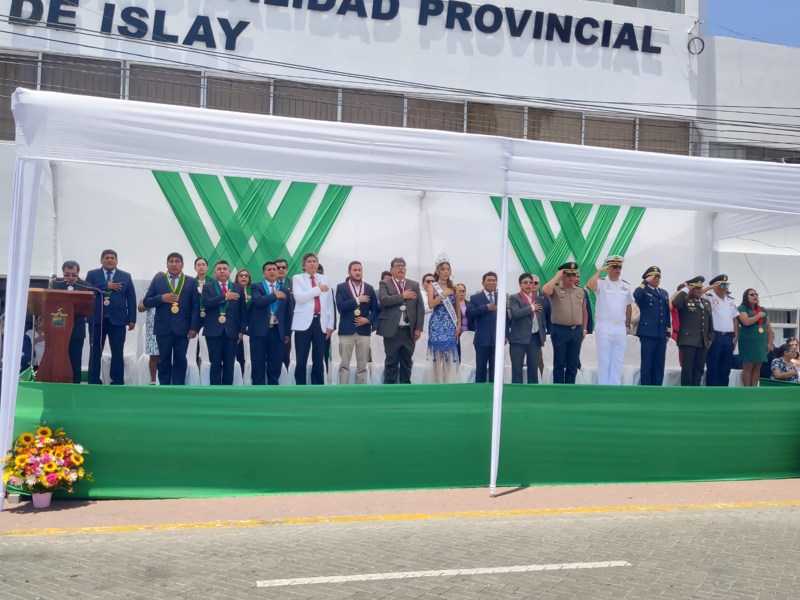 En este recinto cívico se realizó el izamiento del pabellón nacional, a cargo del prefecto regional de Arequipa, acompañado por representantes de la Policía Nacional y las Fuerzas Armadas. El izamiento de la bandera de Mollendo fue encabezado por el alcalde provincial de Islay, Richard Ale Cruz, junto al concejo municipal y la señorita Mollendo 2026. La ceremonia incluyó la entonación de los himnos nacional y local.