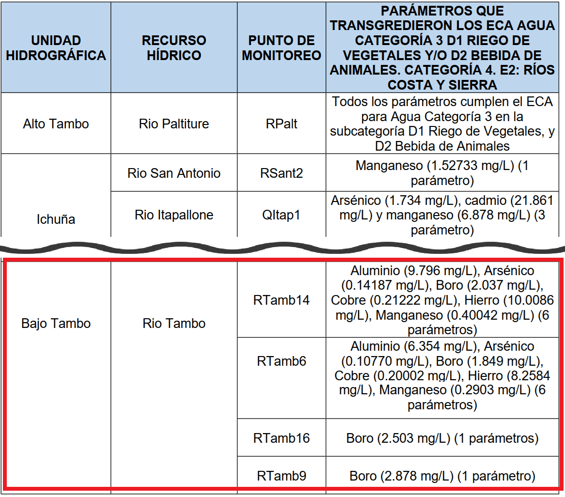 Cabe precisar que el estudio verificó otros puntos de monitoreo de la cuenca del Tambo, en donde también se hallaron valores altos, estos comprenden las unidades hidrográficas (y sus ríos o recursos hídricos) de Ichuña, Coralaque, Medio Tambo y Medio Tambo (Carumas) evidenciando, en general, concentraciones preocupantes de metales, especialmente aluminio, hierro, arsénico y boro. Estos excedentes están vinculados con fuentes naturales, así como con actividades agrícolas y mineras en zonas altas de la cuenca.