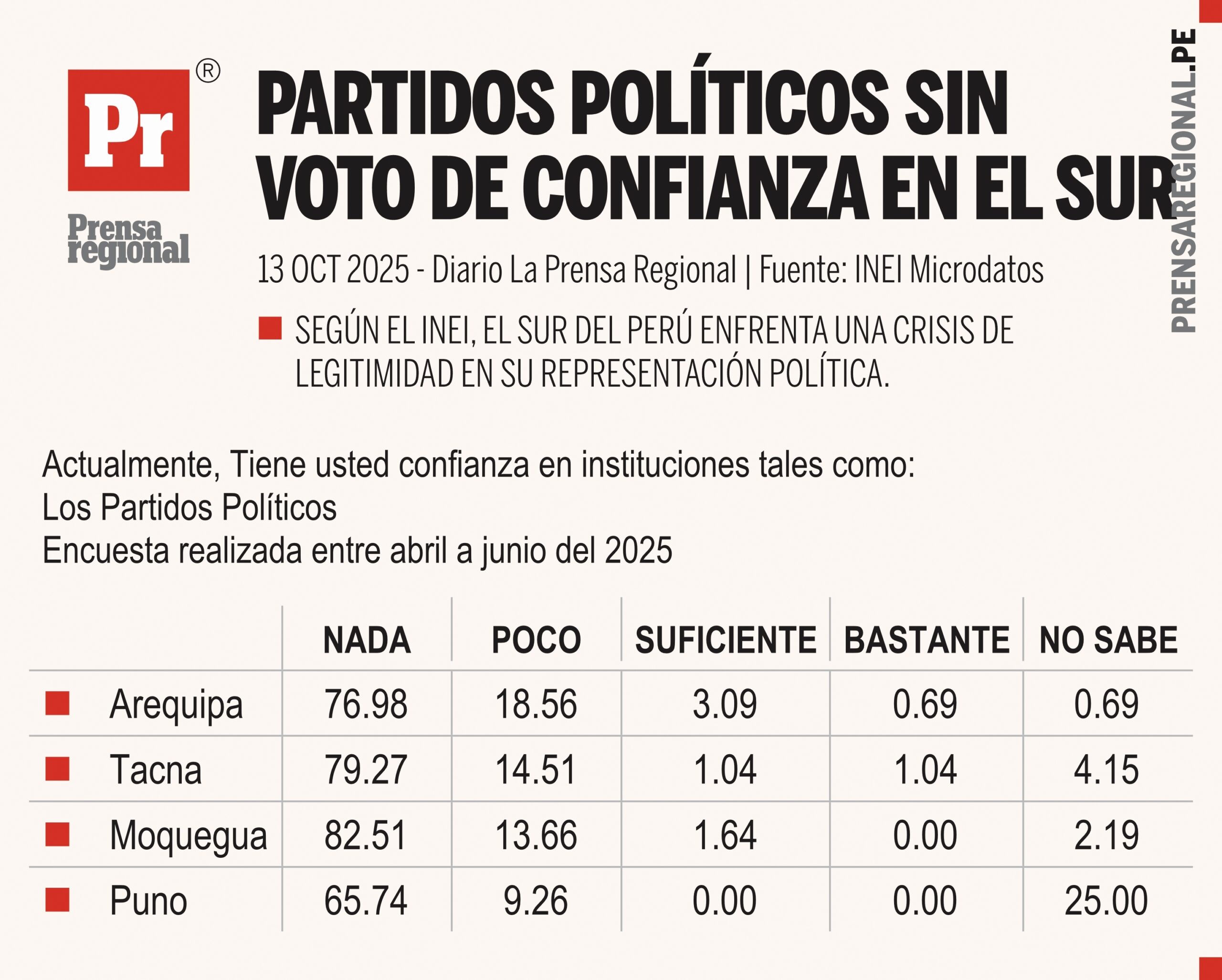 En el sur peruano, más del 90% de los ciudadanos manifiesta nula o escasa confianza en los partidos políticos, que se consolidan como las instituciones con menor credibilidad del país.